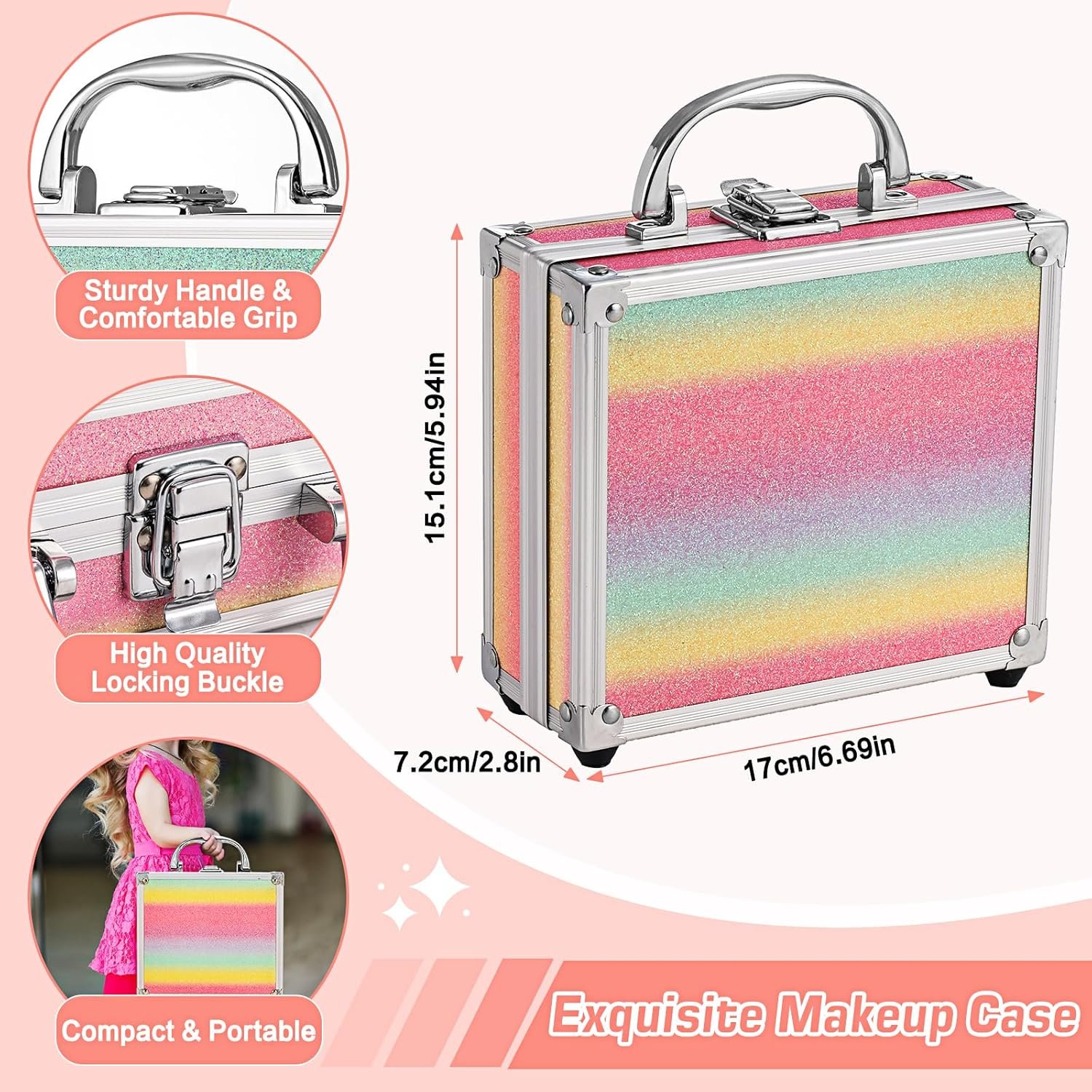 Sleek & Compact Cosmetic Case: Measuring 6.7×2.8×5.9inch (LxWxH), it is compact and portable for on-the-go use. The top handle ensures effortless carrying with a comfortable grip. Plus, it boasts an attractive look and reinforced aluminum frame for durability and style.