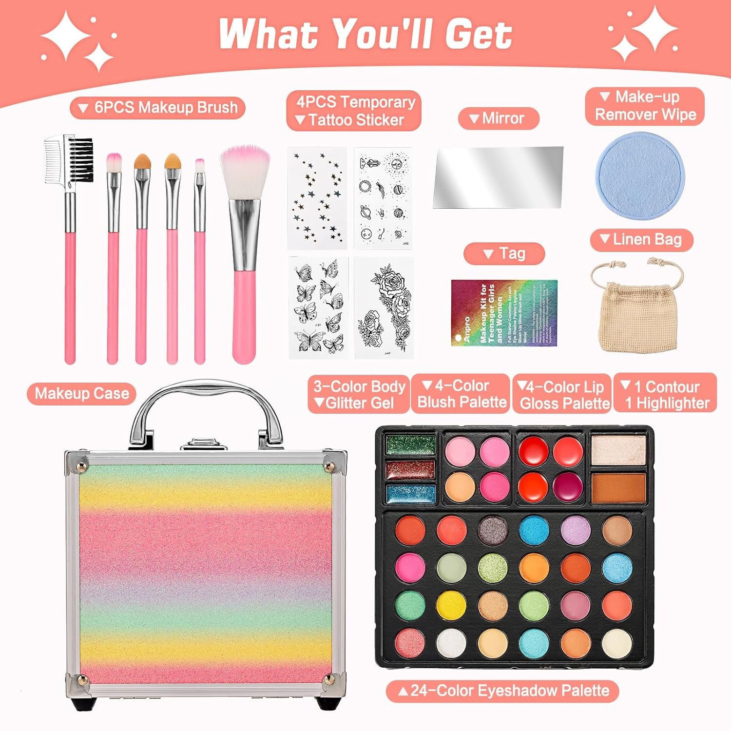 Pro Teen Makeup Kit: This kit includes a 24-color eyeshadow palette, 4-color lip gloss palette, 4-color blush palette, 3-color body glitter gel, highlighter, contour, 4 temporary tattoo stickers, makeup remover wipe with linen bag, 6 makeup brushes, mirror, and tag, all neatly packed in a stylish case.