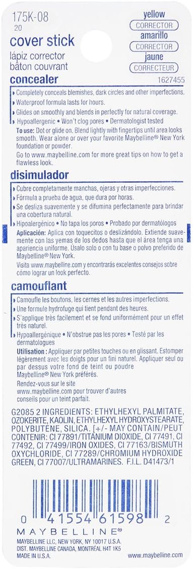 Completely conceals blemishes, dark circles and other imperfections. Waterproof formula lasts for hours. Glides on smoothly and blends in perfectly for natural coverage. Hypoallergenic. Won’t clog pores, dermatologist tested. Match your skin tone or choose from color corrective shades: yellow corrects dark circles, green corrects redness.