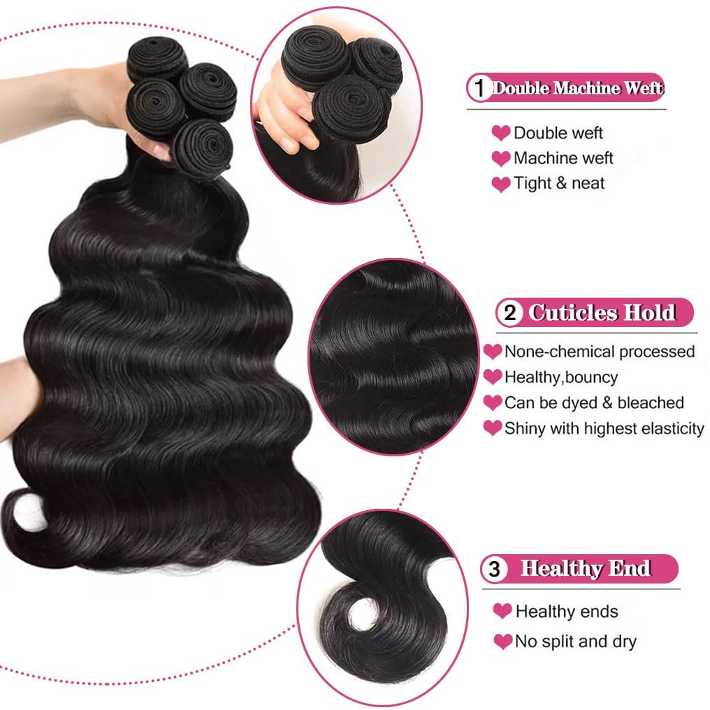 Hair Quality: 10A Grade Body Wave Bundles Human Hair, Remy Hair Ocean Wave Bundles; Double Machine Weft, Hand Tied, Full and Smooth with Healthy Hair Ends; Shiny&Bouncy, Soft&Thick, Tangle Free, Shedding Free, Unprocessed Natural Color