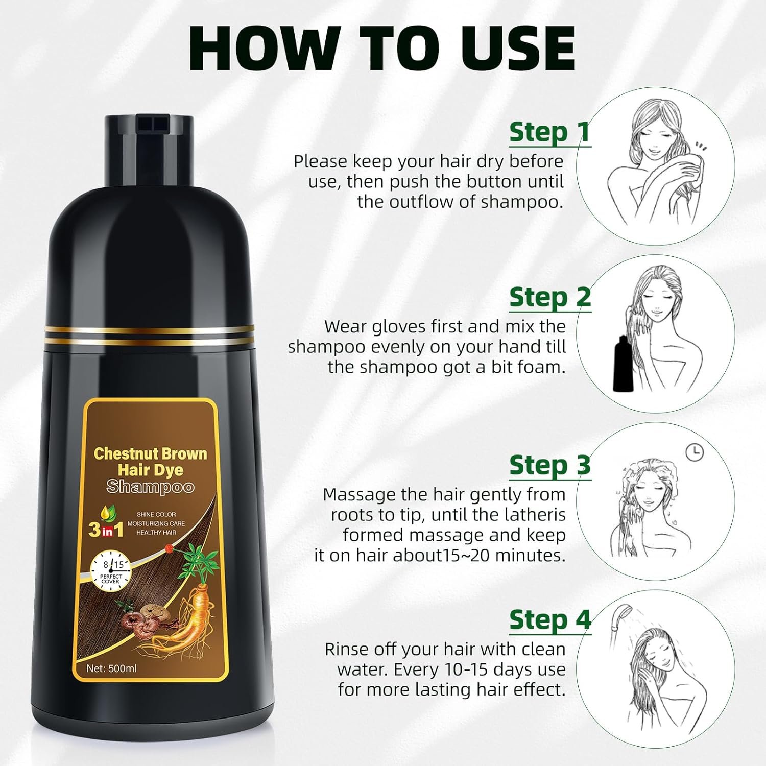 Easy to Use: Say goodbye to complex coloring routines. Simply apply our color shampoo to wet hair, leave it on for 15-20 minutes, and rinse thoroughly. Effortless beauty for a rejuvenated look.
