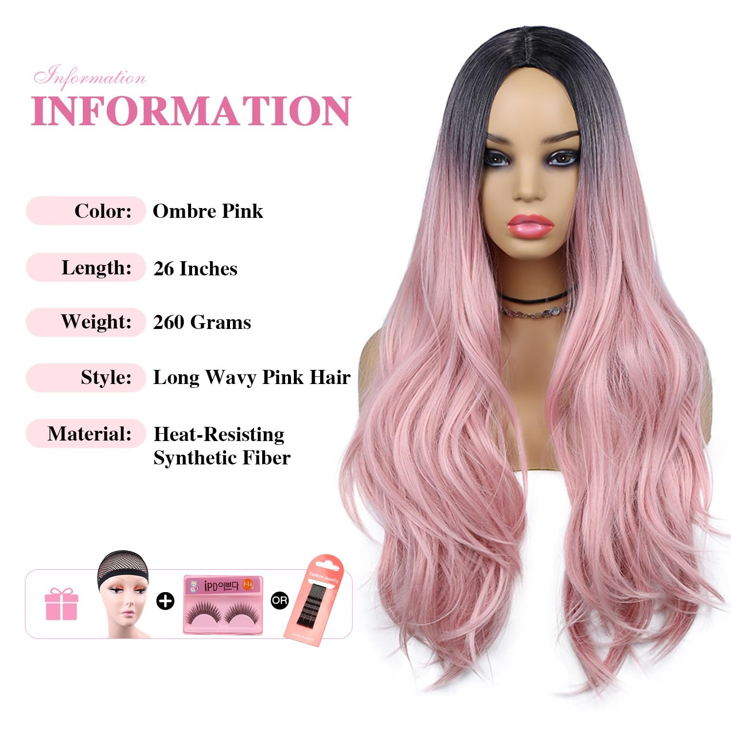1.Wig Material: The long wavy pink hair is made of high quality heat resistant synthetic fiber, full machine made none lace wig. Skin friendly, touch soft.