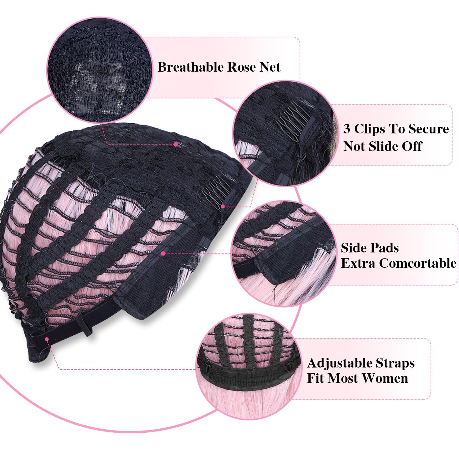 2.Wig Cap Size: The long pink hair cap size is adjustable, and no pins or tape should be required. There are two adjustment straps inside wigs, suit for most head sizes.