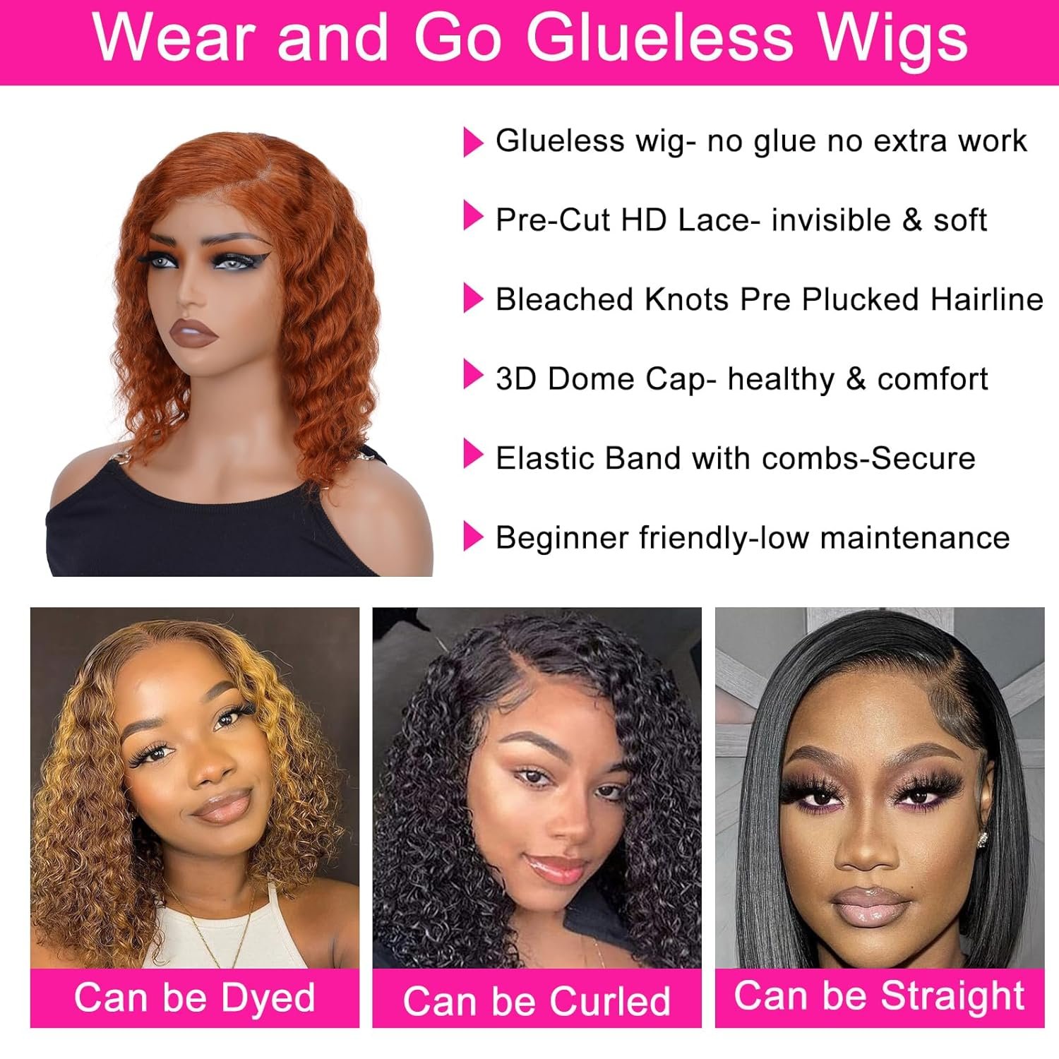 Wig Material 100% Unprocessed Virgin Human Hair Deep Wave Bob Curly Wear and Go Glueless Wigs Lace Size 4×4 Left Side Part Glueless Wig, Can do Middle Part, Free Part and Side Part and Restyled Lace Materials Glueless Wigs Human Hair Pre Cut HD Swiss Lace , Match All Skin Tones Perfectly Natural Looking Wig Advantages Save Time and Energy, 30s Put on and Take off ,No Glue no gel, Ready to Wear Wigs Glueless Human Hair Pre Plucked Bleached Knots Hair Color Ginger Orange Wear and Go Glueless Wig,Ginger Curly Wig Wig Cap New 3D Dome Cap, More Breathable and Comfortable; Medium Cap Size (22-22.5 Inches), Elastic Band with Adjustable Straps Wig Quality Top Quality Virgin Human Hair, No Shedding, No Tangles, No Split Ends, Bouncy, Lasting Silky Look and Feel Soft Wig Length 10 12 14 Inch Bob Wig Human Hair,True to Length and Weight