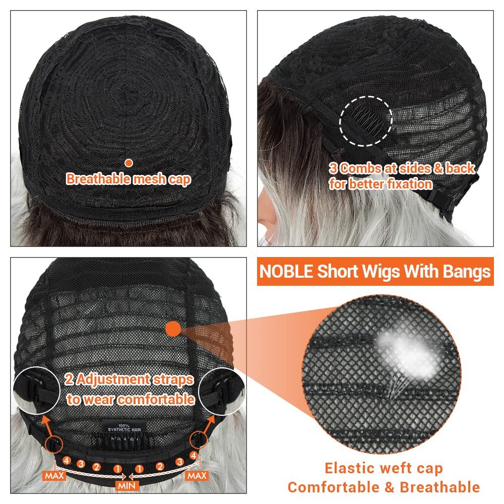 【NOBLE Wigs wih Bangs】100% high-quality heat resistant synthetic fiber, resilient and smooth, tangle-free, sheeding-free. Can be straightened and reshaped, suitable for party and daily use.