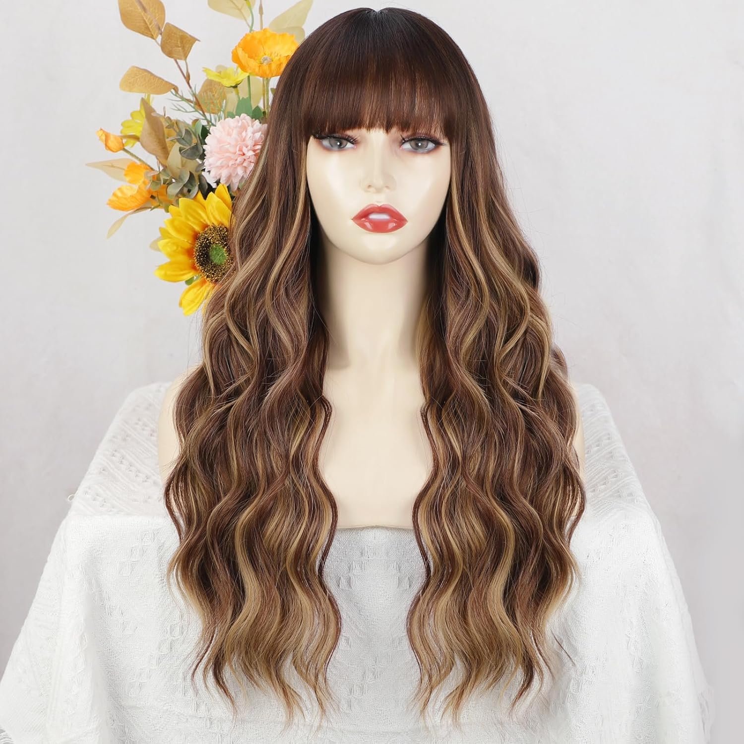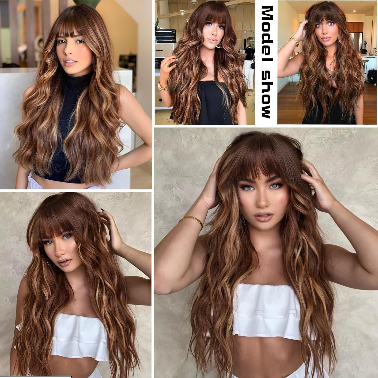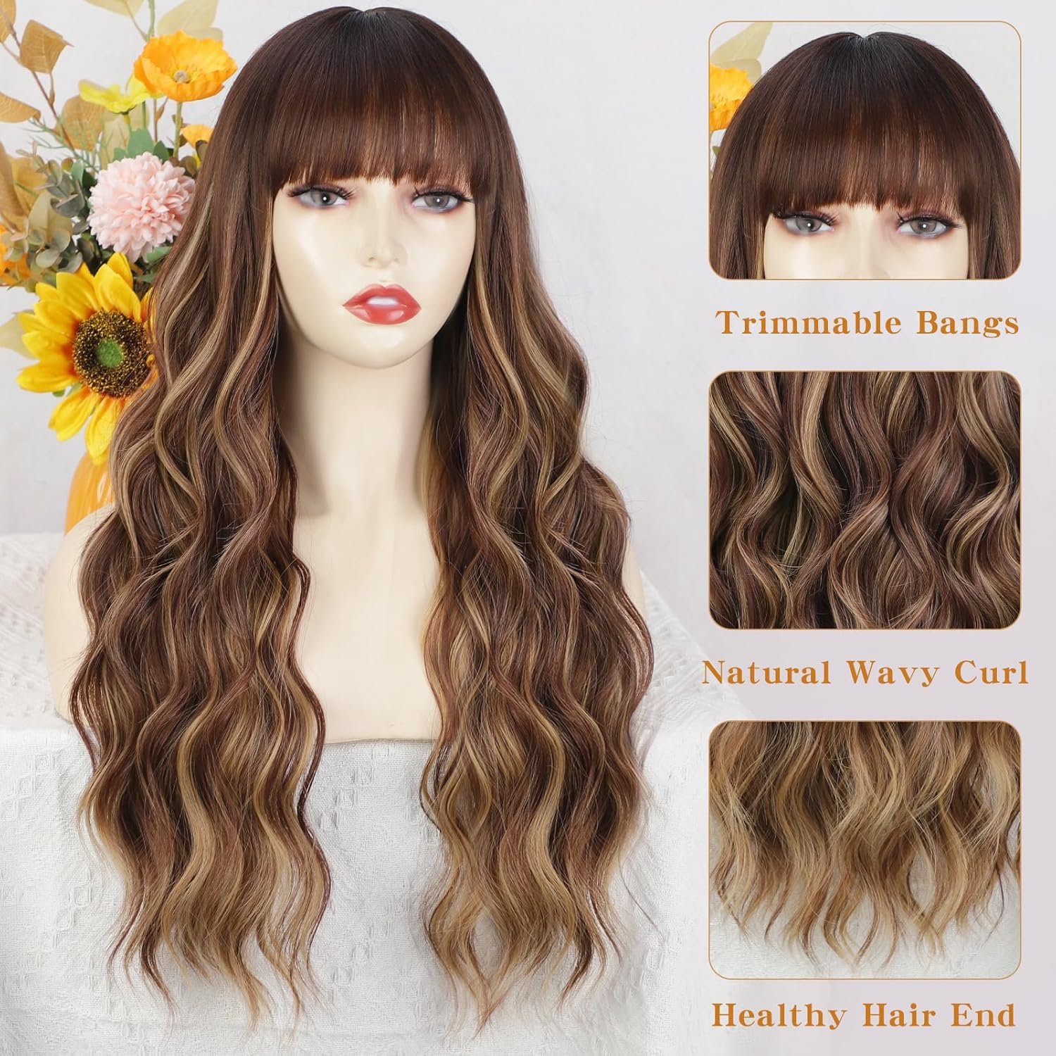 【Stunning Hair Color】 This wig with bangs is a combination of warm brown and bright blonde. This combination gives the wig a natural and radiant look that complements all skin tones, making the wig a truly glamorous and alluring choice.