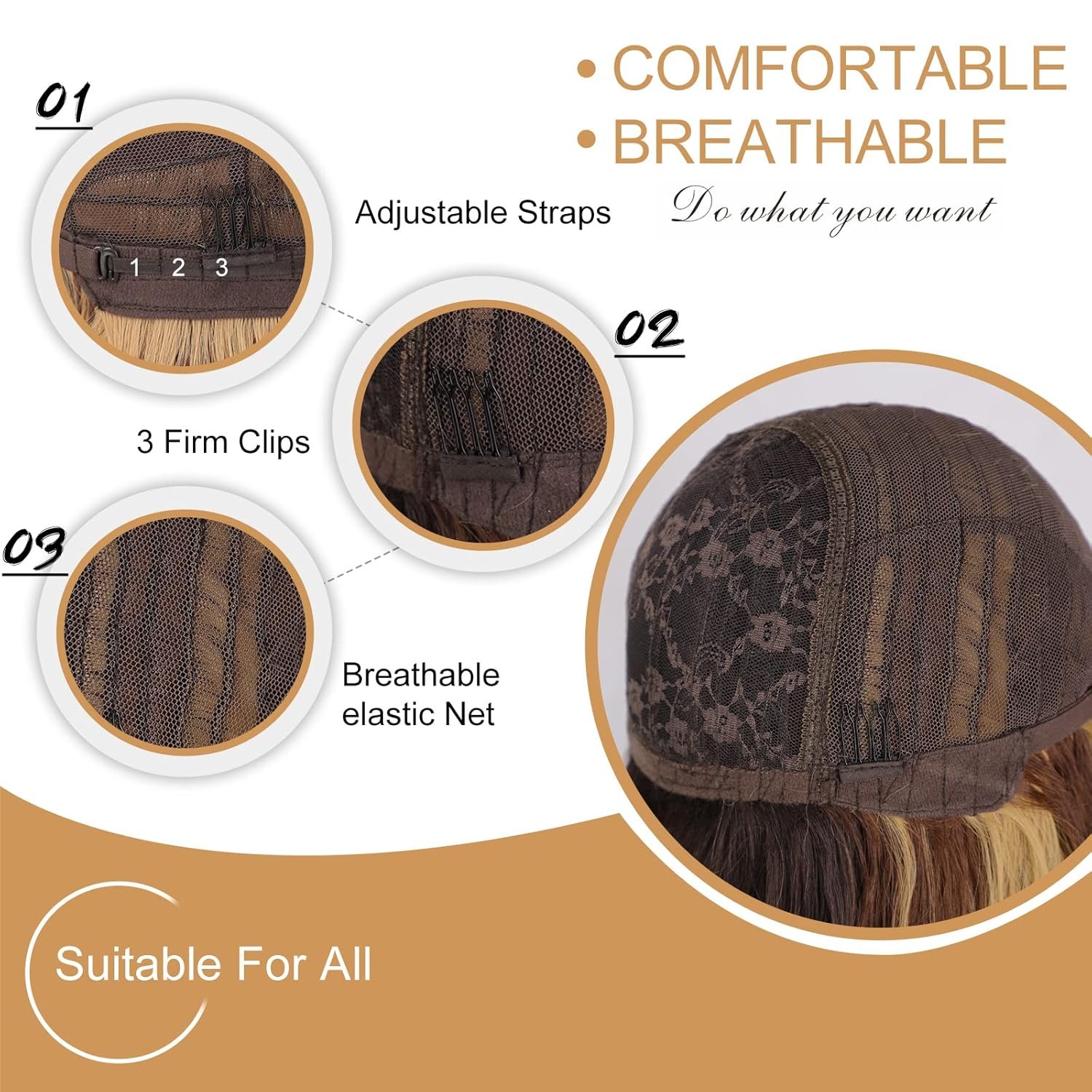 【Lightweight & Comfortable Material】 Made of high quality material, this brown highlight wig is very lightweight and comfortable, soft to touch and can be used multiple times. The breathable elastic inner mesh, firm clip, and multi-position adjustment strap make you more comfortable when wearing it.