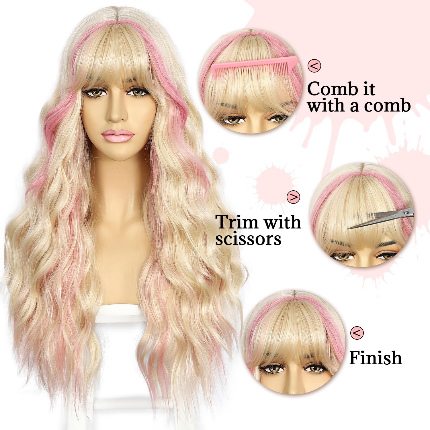 【Long Wavy Wig with Bangs】The long wavy wig is designed very fluffy and have charming wavy.The wig made of heat-resistant synthetic fiber,This material is more durable,soft and less shedding.Easy to comb it and not easily tangle.