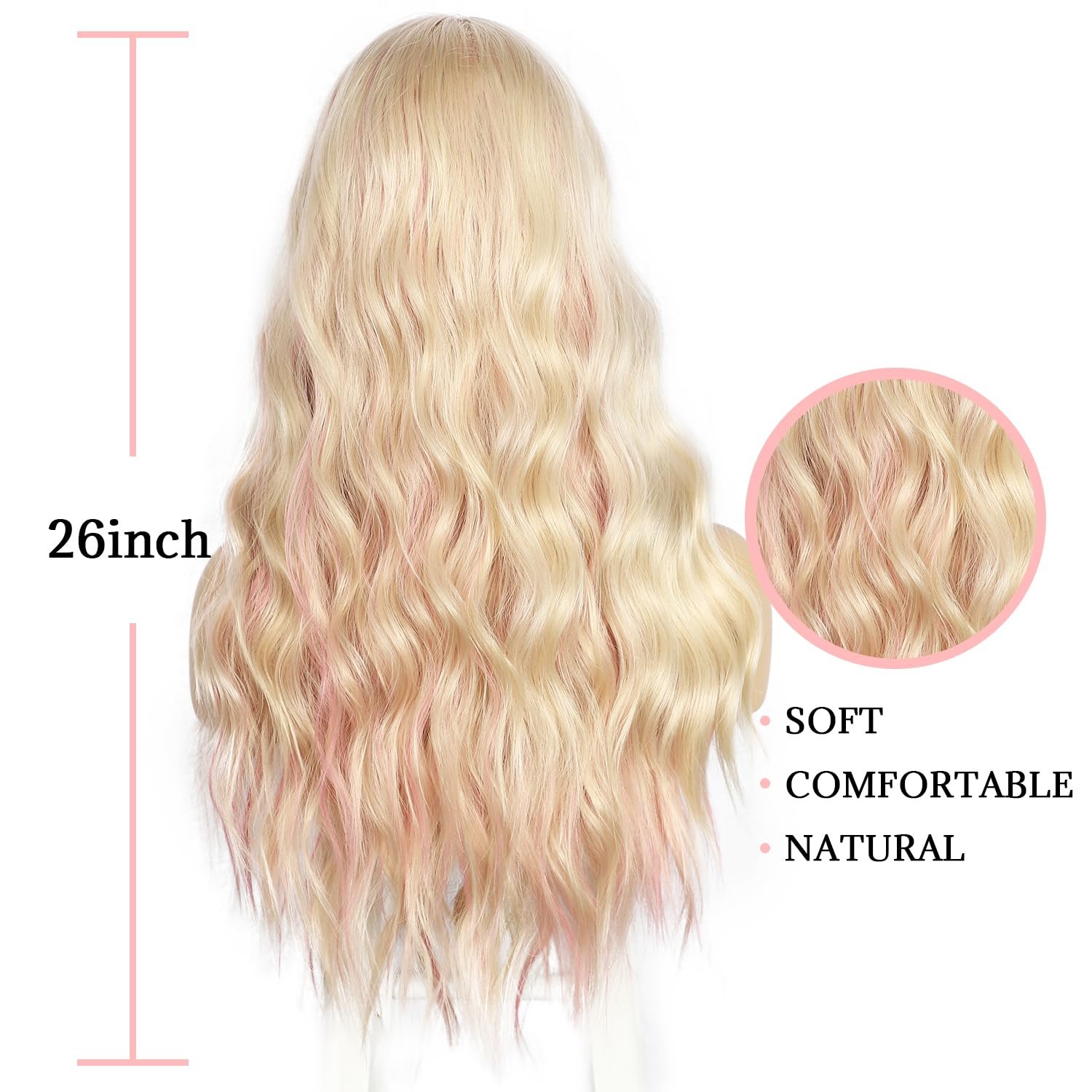 【Highlight blonde Wig Detail】The Length of the long wavy wig is 26 inch.TThe wig net cap comes with adjustable buckles and straps inside, which can be adjusted according to your head circumference,with an adjustable range of 21-23 inch.