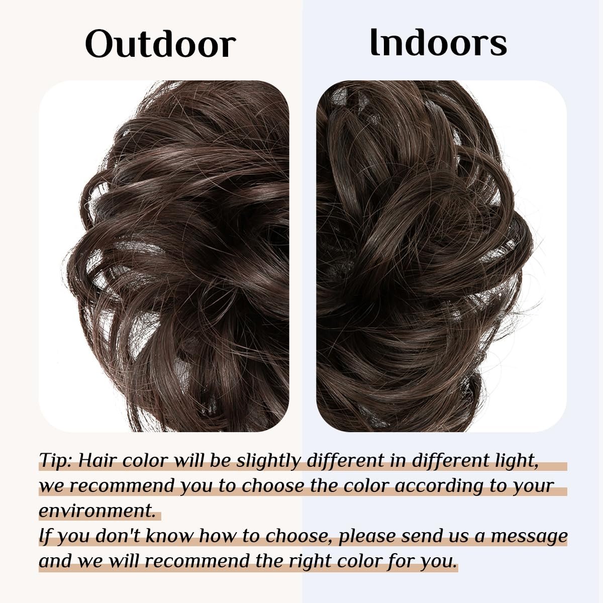 『Tips』: Hair color is sensitive to light, so make sure to choose the right color in normal light. If you’re not sure, send us a message and our customer service team will help you out. Remember to shake and comb the product after receiving it to make the hair bun fuller.