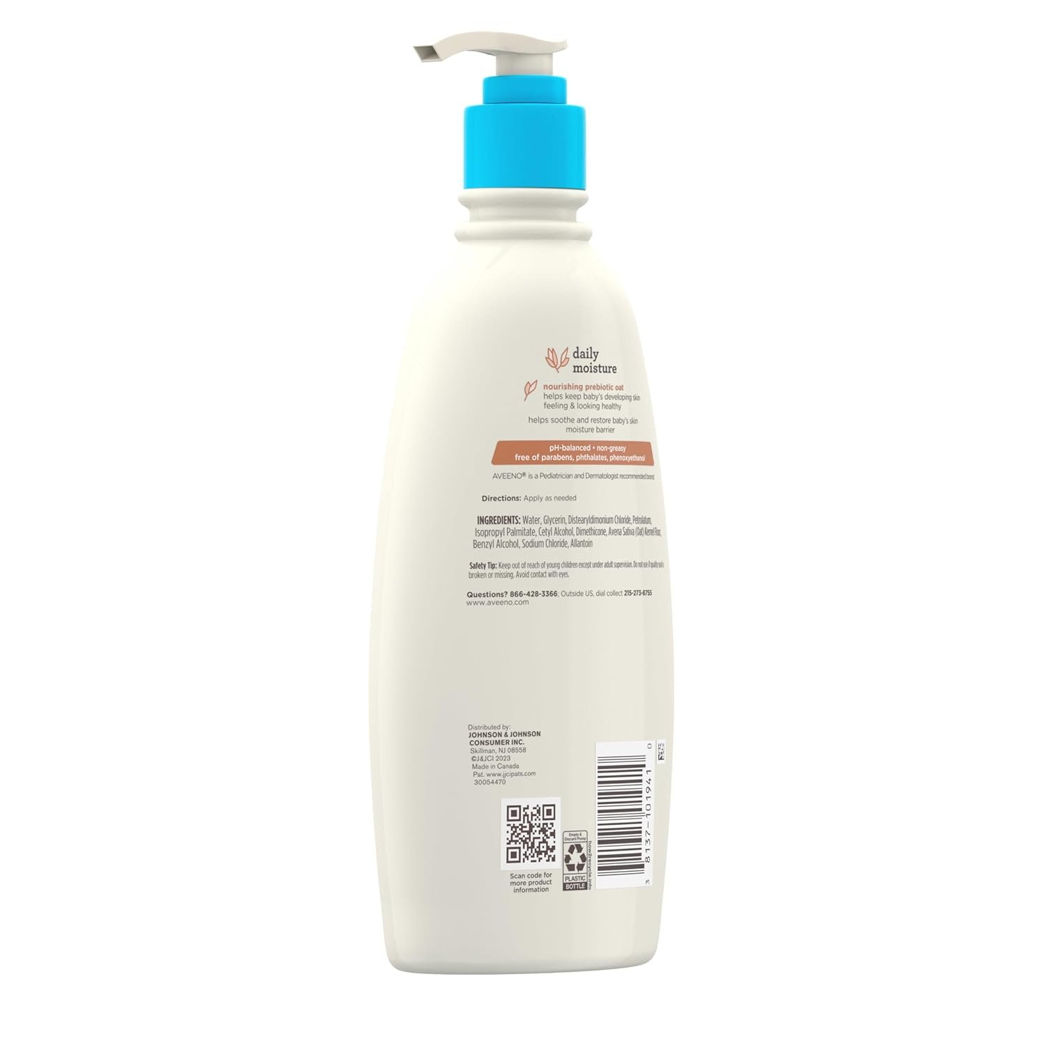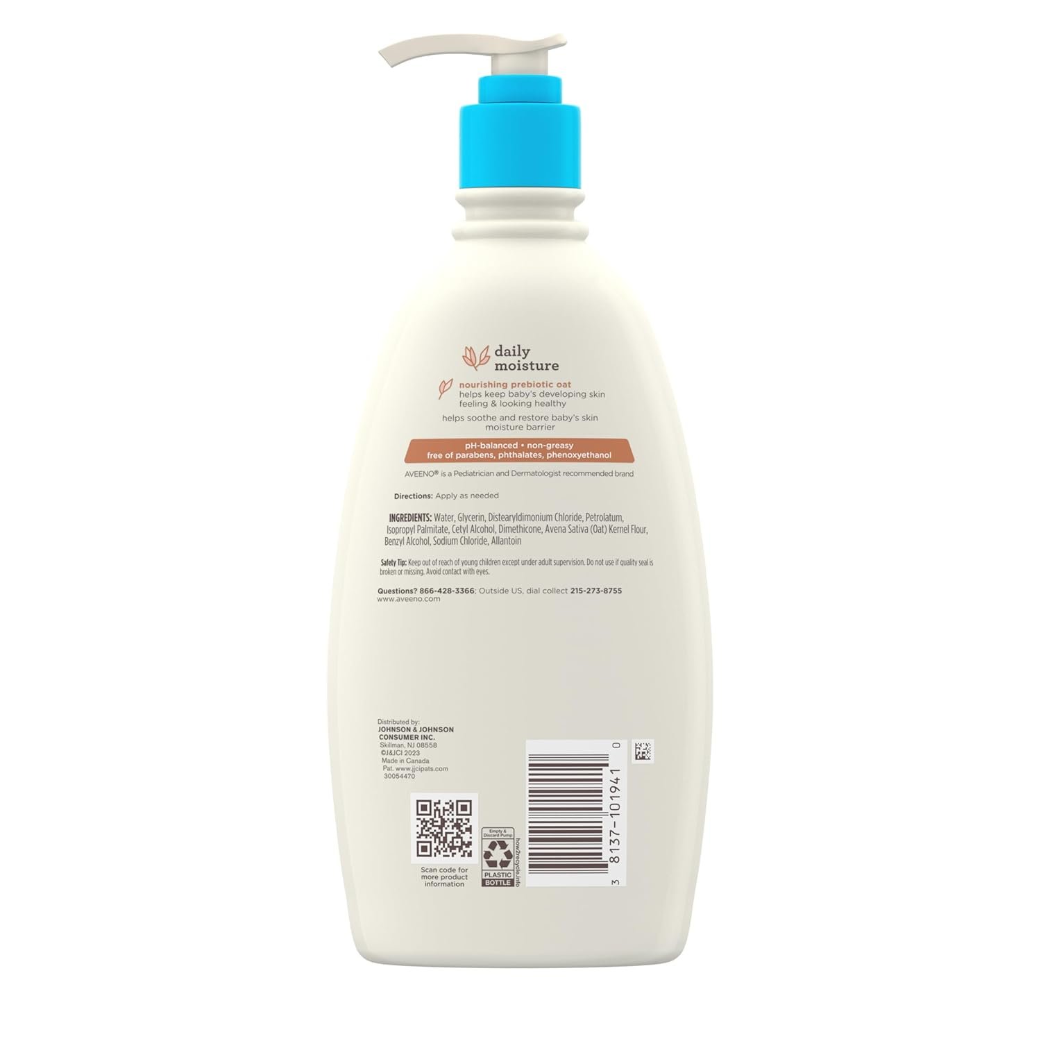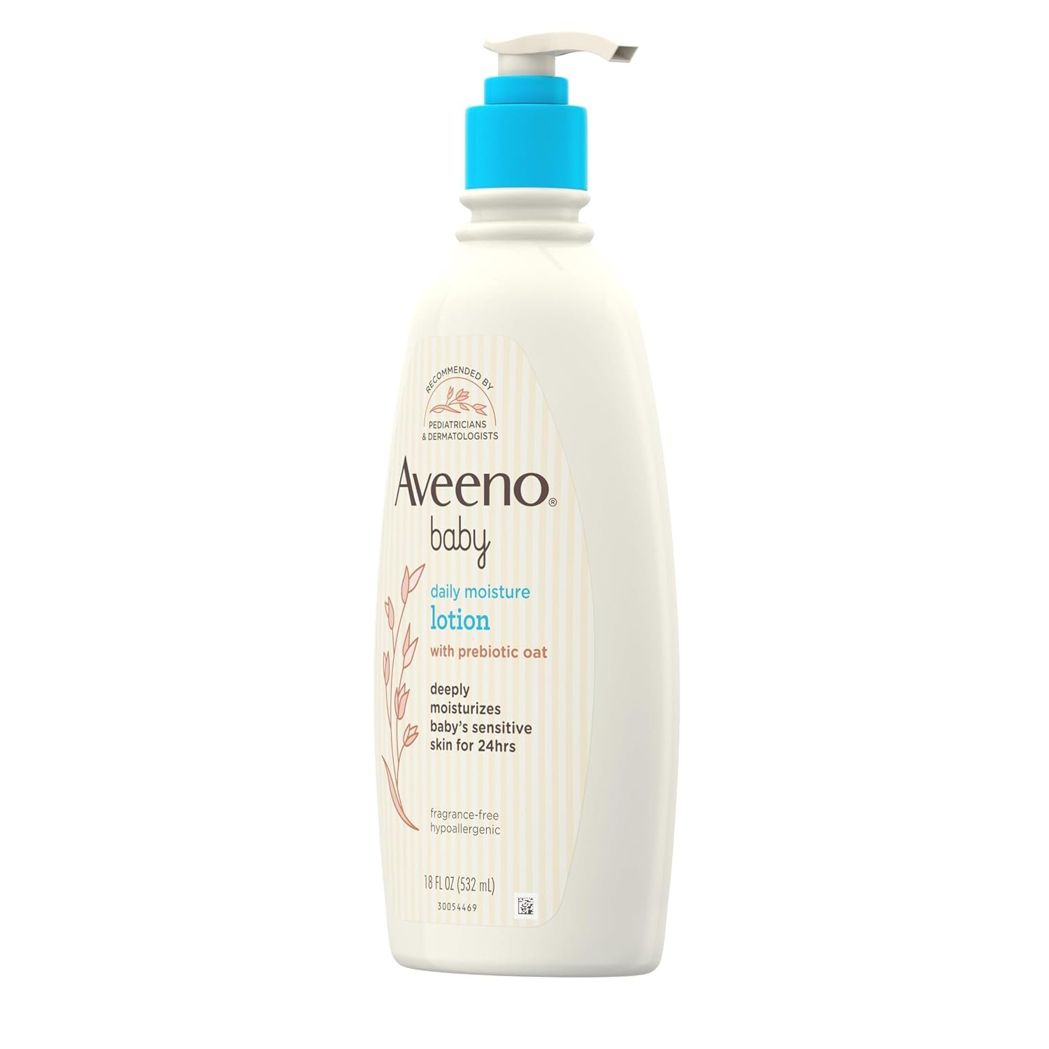 18-fluid ounces of Aveeno Baby Daily Moisture Body Lotion with natural colloidal oatmeal, dimethicone and rich emollients features a naturally nourishing formula that moisturizes for a full 24 hours