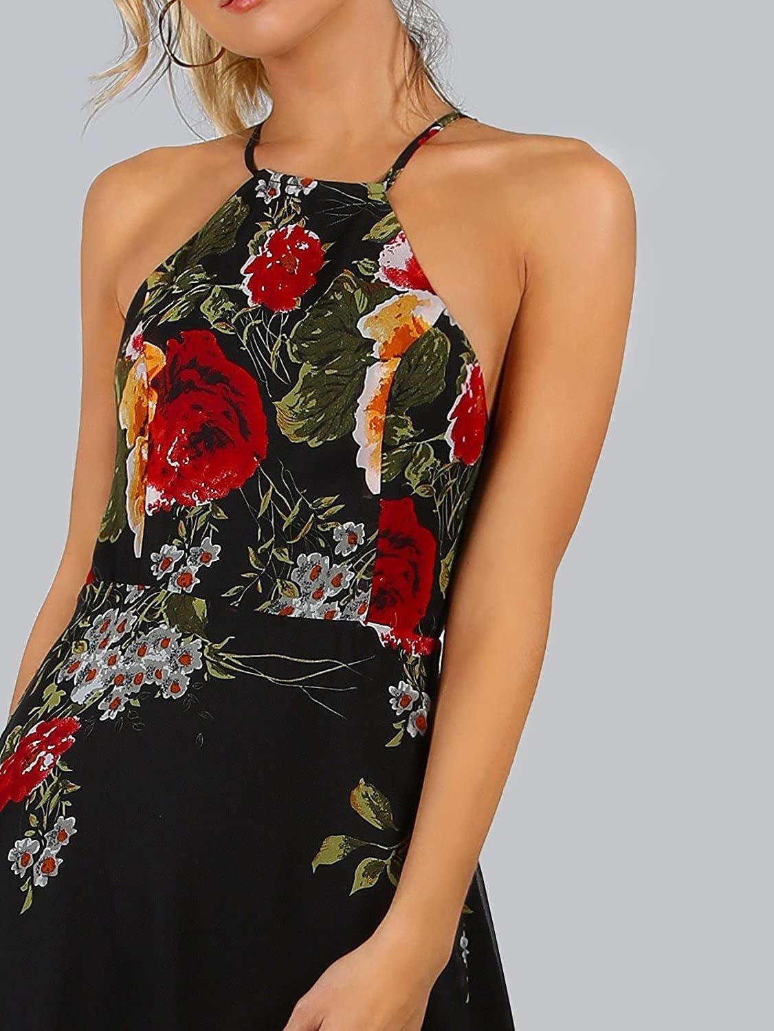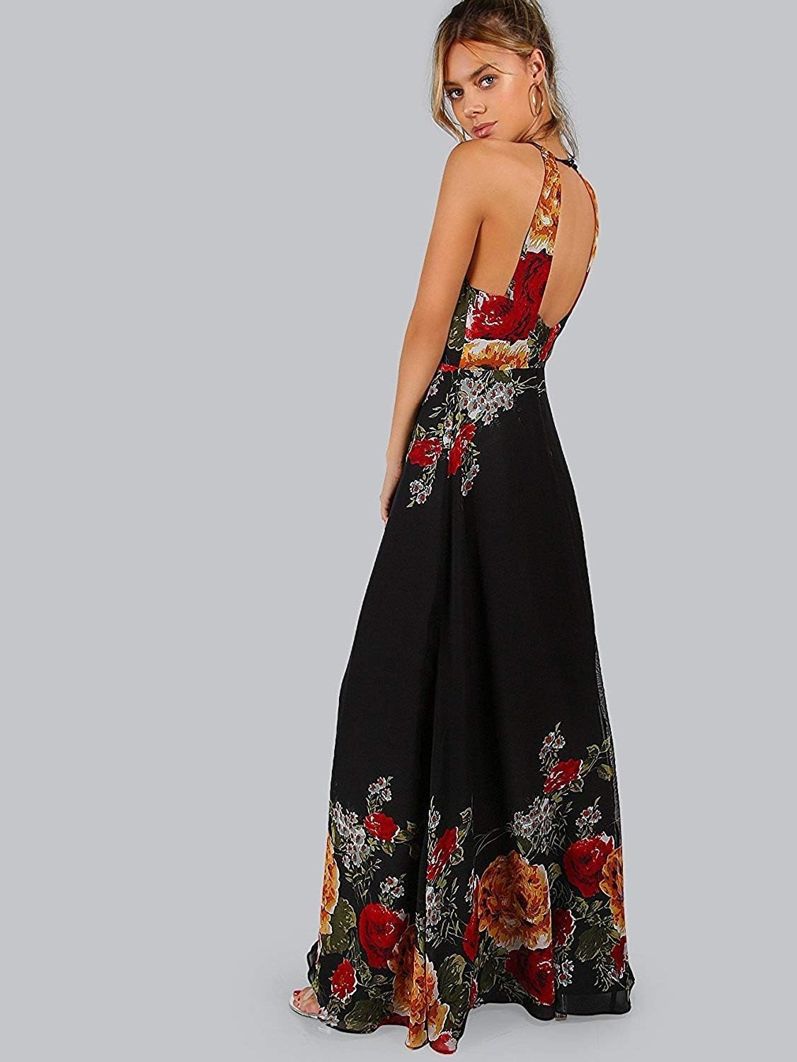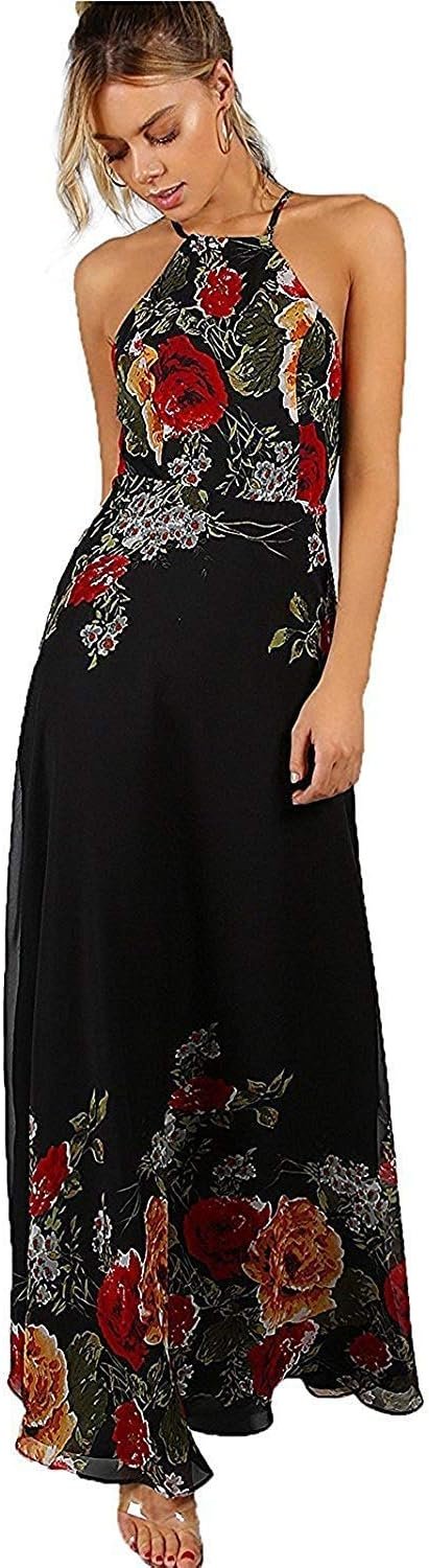 The length of the long dress may be a bit long. Please refer to our Size Chart from the Product Description, or you can wear the high heels. Sleeveless, halter neck, backless, zipper back, vintage style, flower printed, full length, maxi dress.Suitable for summer beach, party, cocktail, evening, club, holiday, vacation and daily wear.