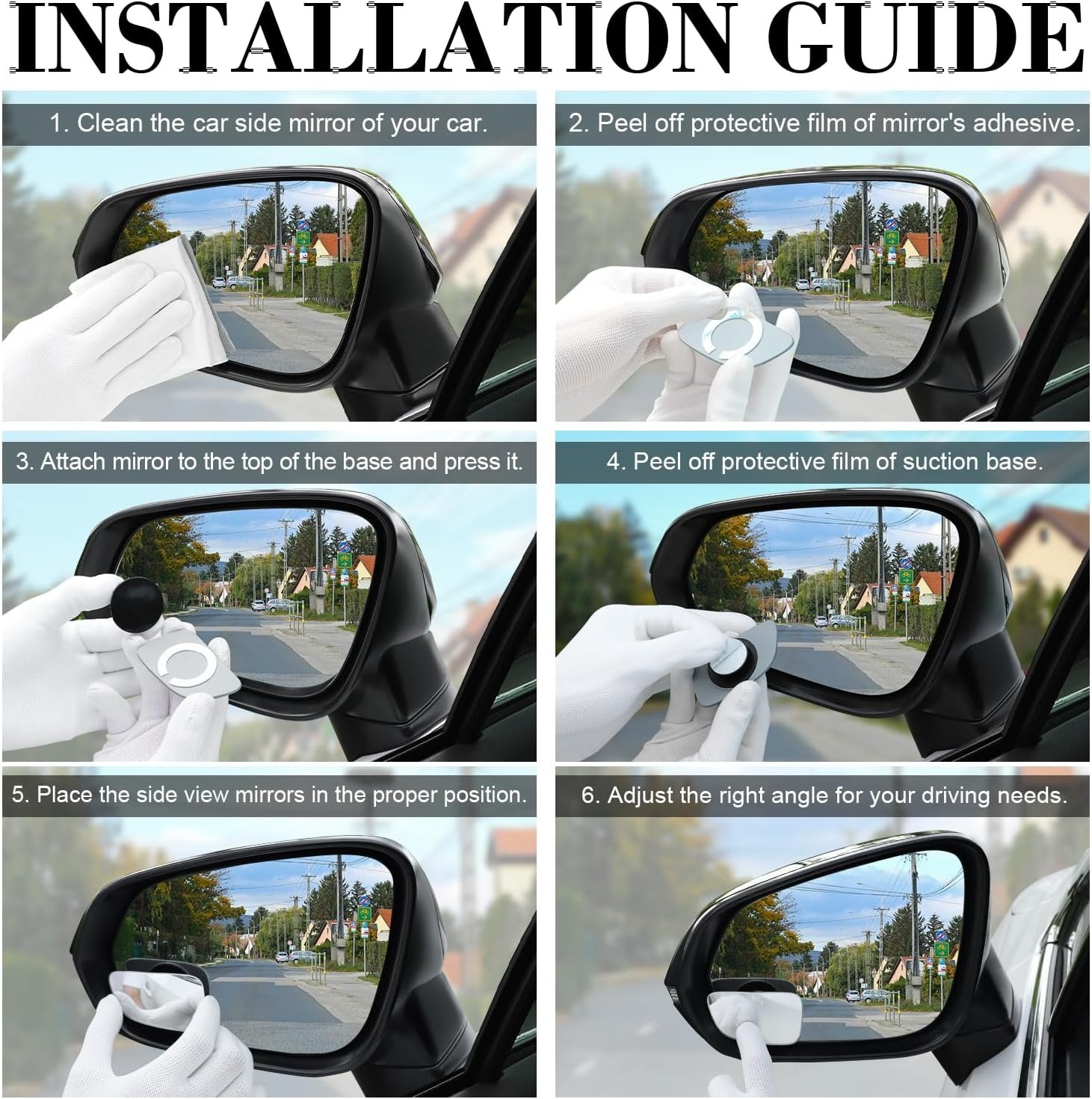 【Easy to install】Please clean your original car side mirro, then stick blind spot mirrors to the mounting bracket and install them on side rear view mirrors.