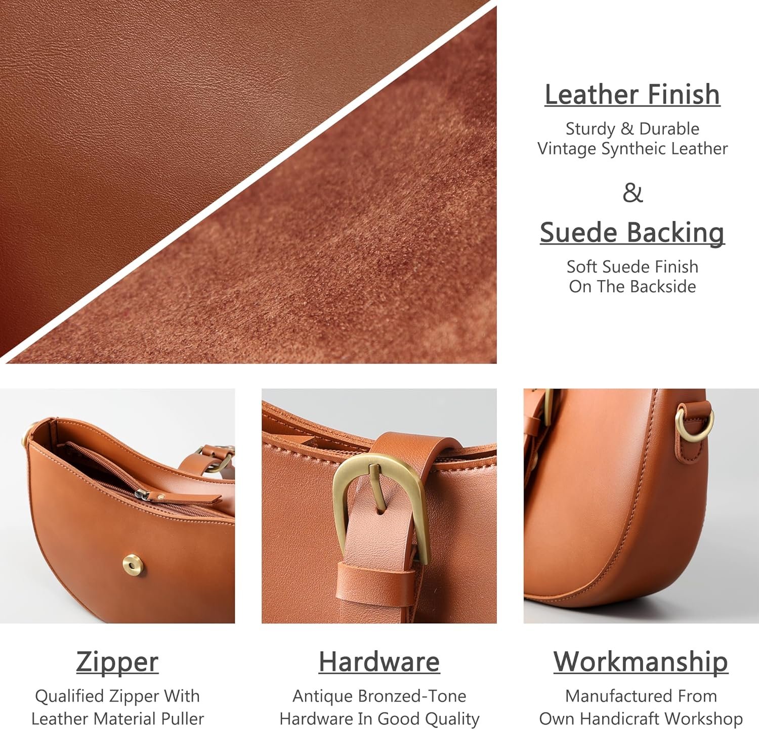 Outer material: High-grade vegan synthetic leather (Sturdy & Pliable). / Inner material: Faux suede which is like the rear of real leather.