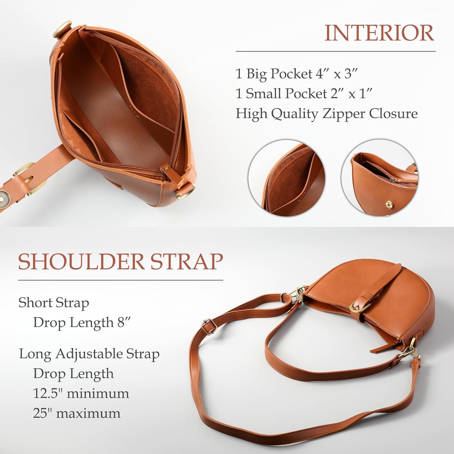 The shorter strap is with 8” drop length for carrying under the arm. / Shoulder strap is detachable and adjustable with 12.5″ minimum or 24″ maximum drop length.