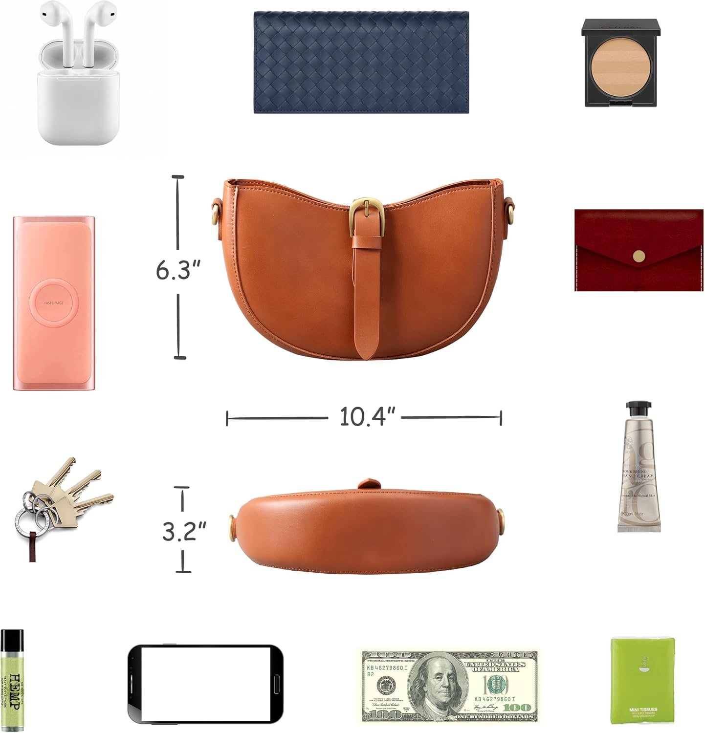The Interior can accommodate lady long wallet (under 7.8” length) and other daily essentials. / There is 1 big pocket (7”x3.2”) which can hold normal cell phone, and 1 small pocket (4.2”x2.2”) can hold cards inside the bag.
