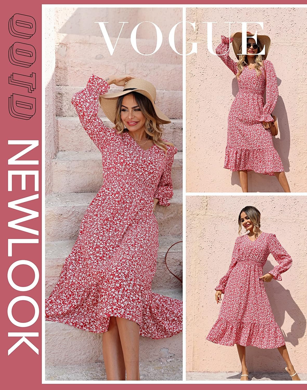 V Neck Long Dresses for Women with pleated hem-The v neck dress for women can highlight your neckline to show your soft femininity well.High waisted Floral Smocked Dress Women-The smocked waist design easily slender your physique and optimize your body proportion, make you more attractive.Long Sleeve Dress for Women with ruffles-This long sleeve maxi dress for women featuring so many cute details can meet all dress lovers’ taste