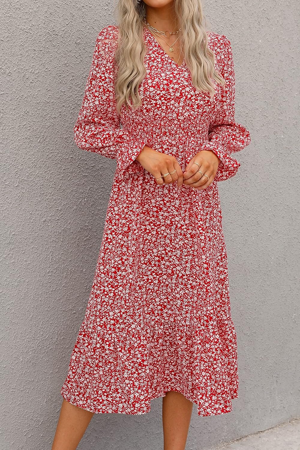 Womens Dresses Stylish Puffy Long Sleeve Floral Dress for Women V Neck Smocked Dress Women