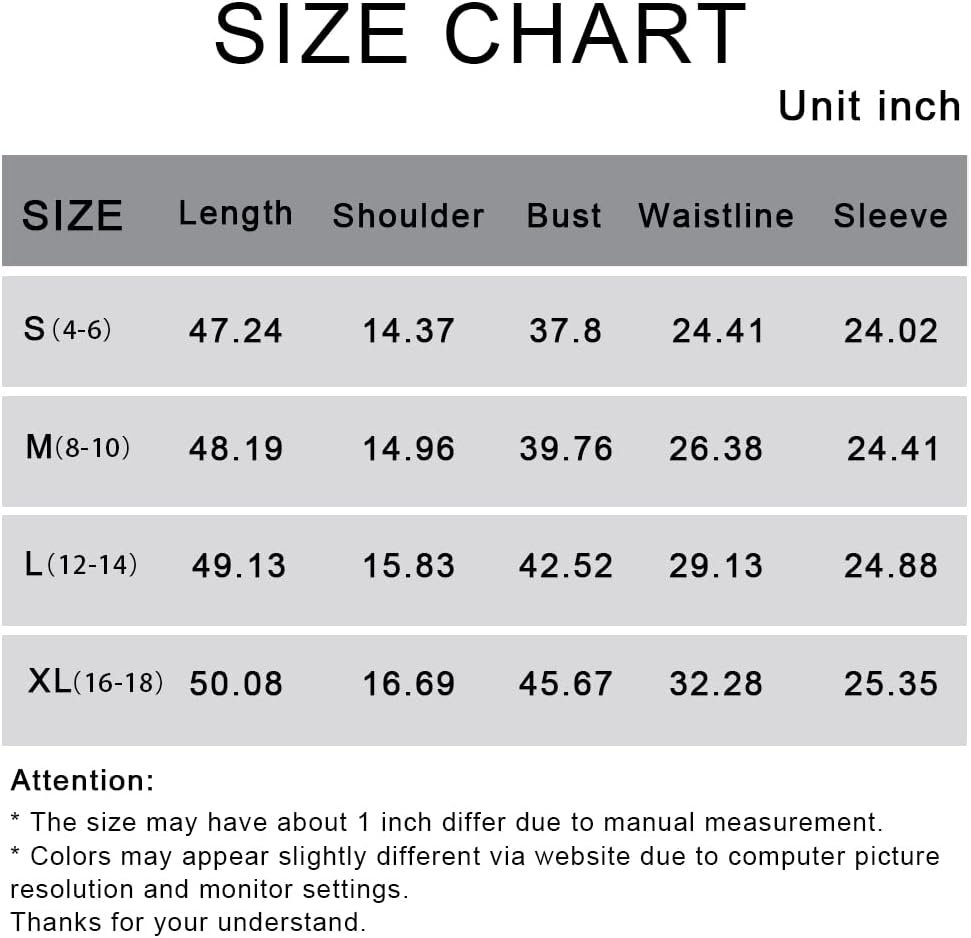 Size Chart: (Unit: inch)S (4-6): Bust 38.58—Waist 24.41—Length 48.03—Sleeve length 24.80M (8-10): Bust 40.55—Waist 26.38—Length 48.82—Sleeve length 25.20L (12-14): Bust 43.31—Waist 29.13—Length 49.61—Sleeve length 25.59XL(16-18): Bust 46.46—Waist 32.28—Length 50.39—Sleeve length 25.98