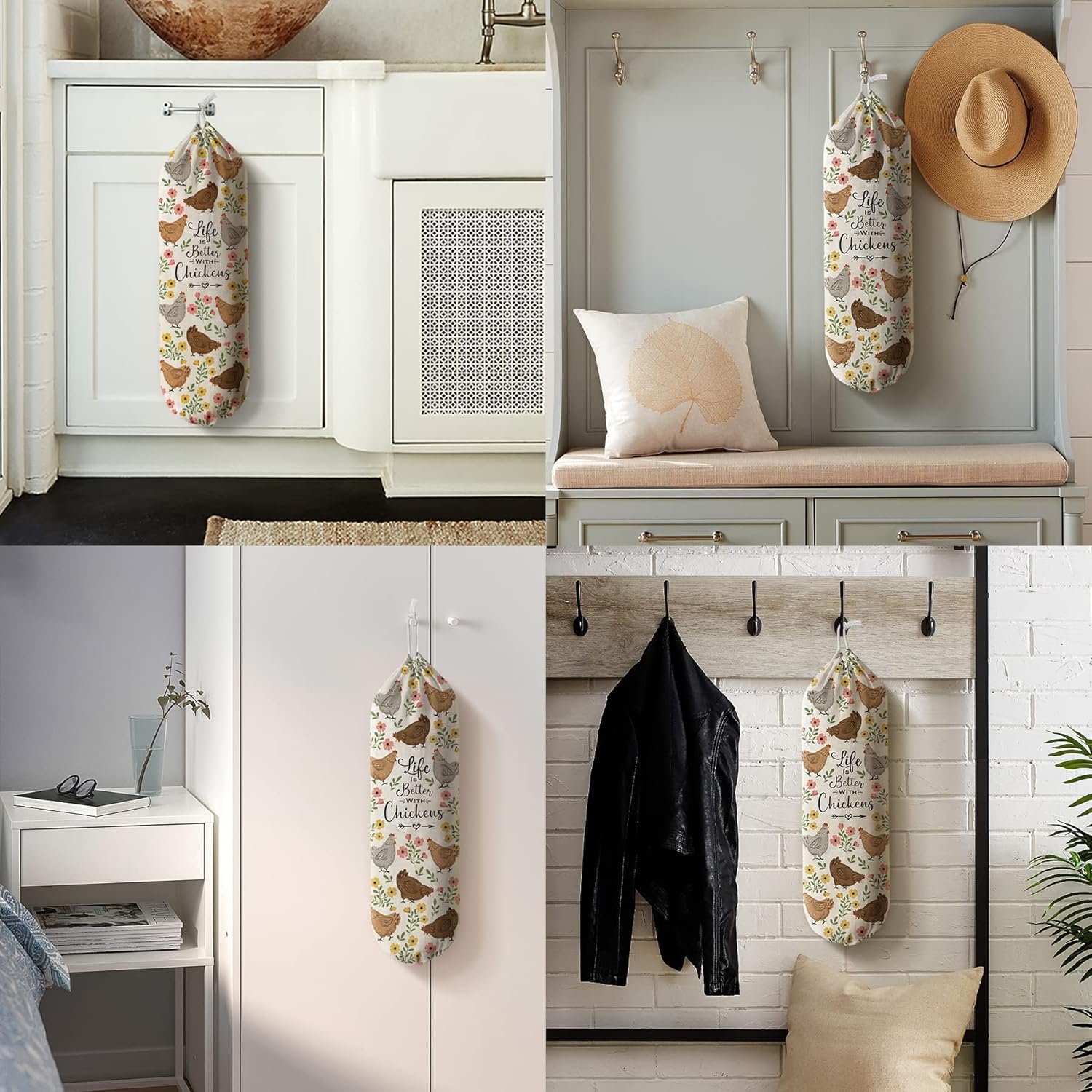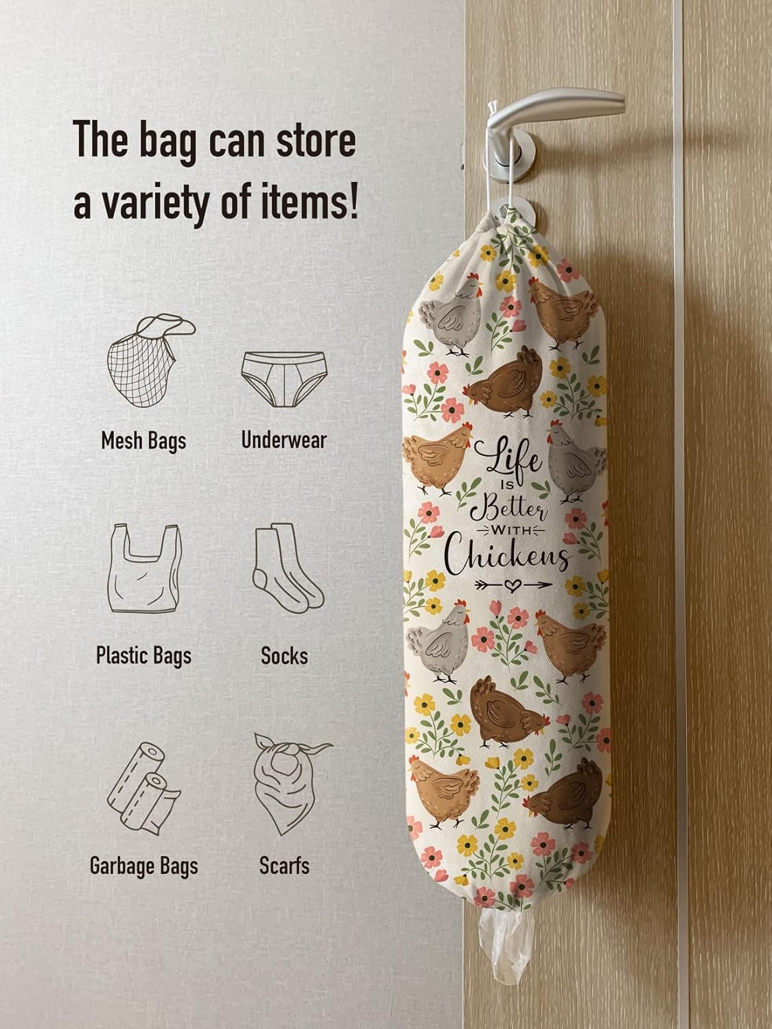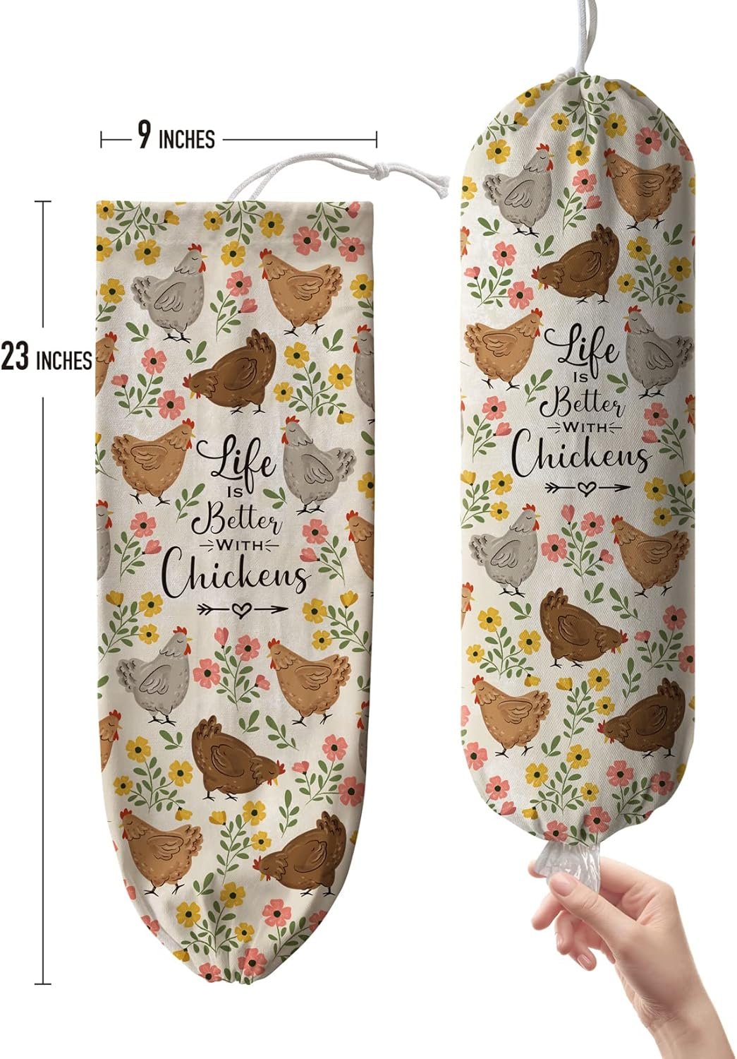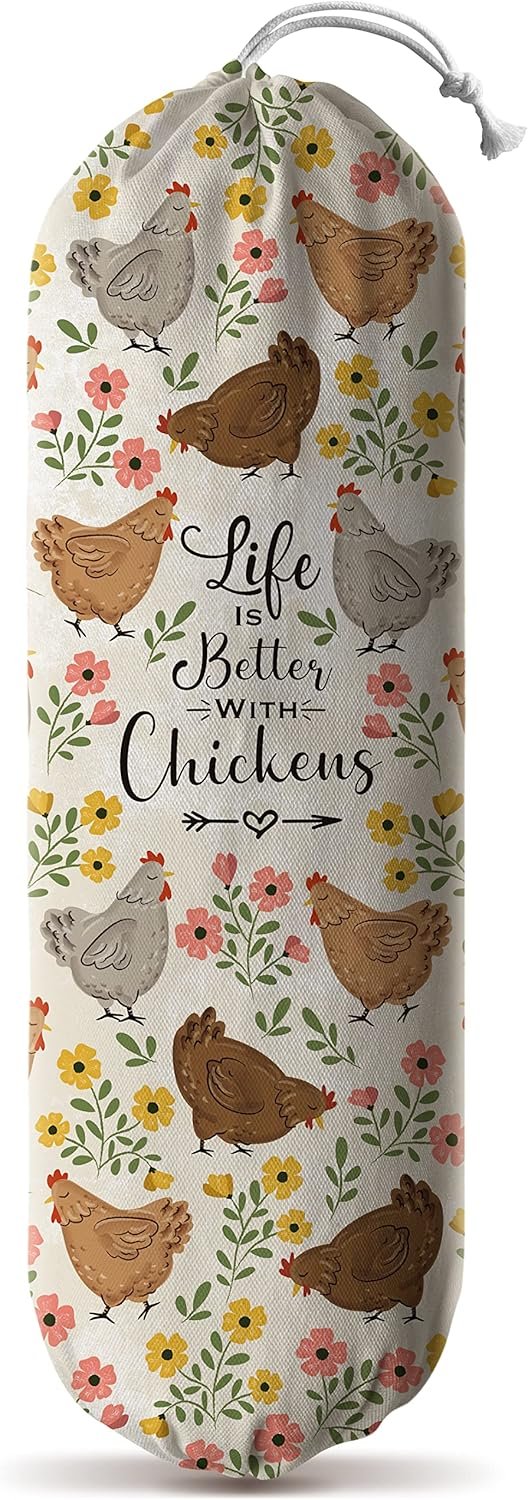 Space Saving&Convenient -Hglian cute lift better with chickens plastic bag holder provides great storage that fits quite a bit of plastic bags in it without taking up too much space.You can hang it anywhere for your convenience and easily grab bags as you need them