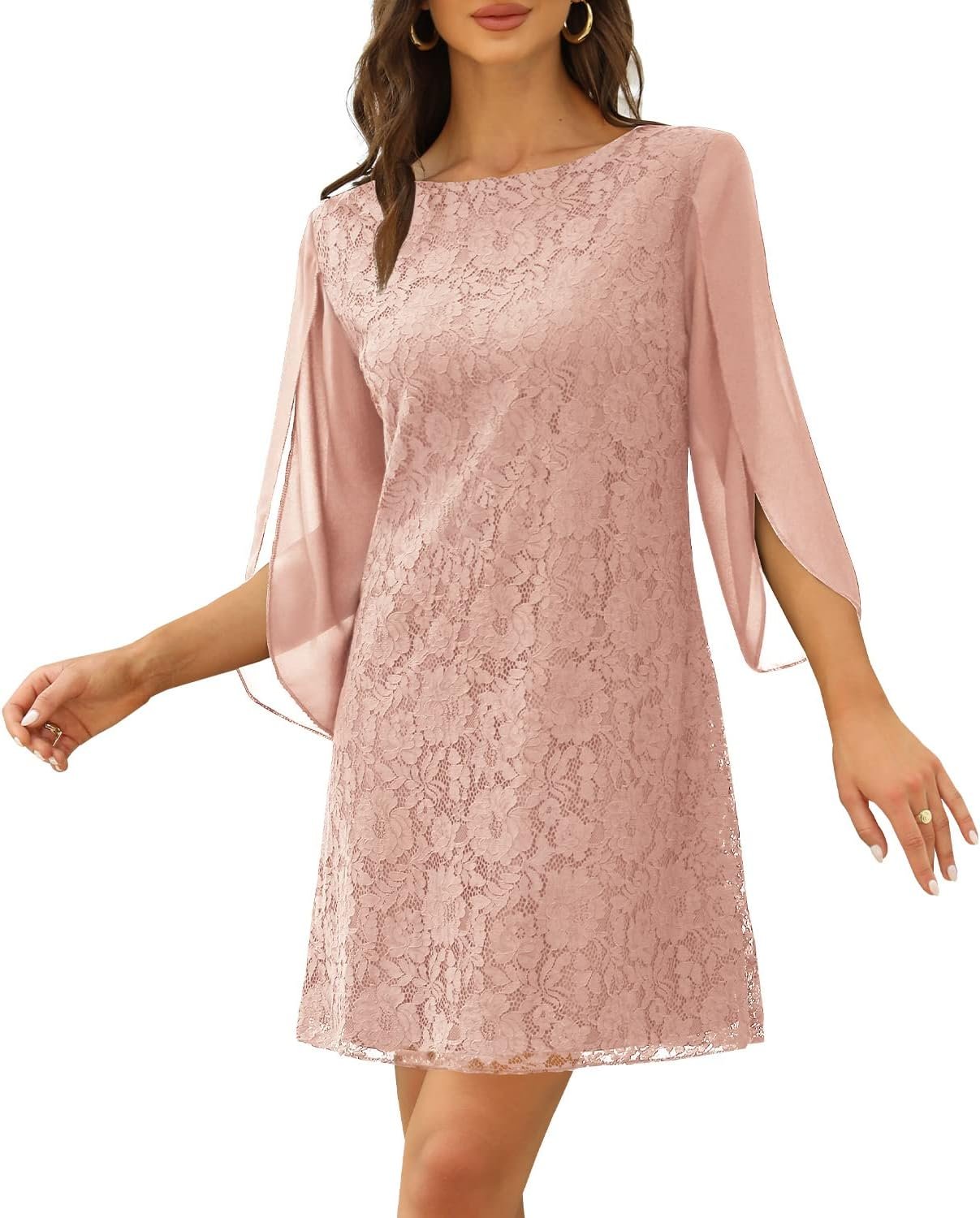 High quality and beautiful lace fabric with sequinsbeautiful and sexy V neckA Line loose waist design3/4 flowy slit sleeveOverall dressing effect