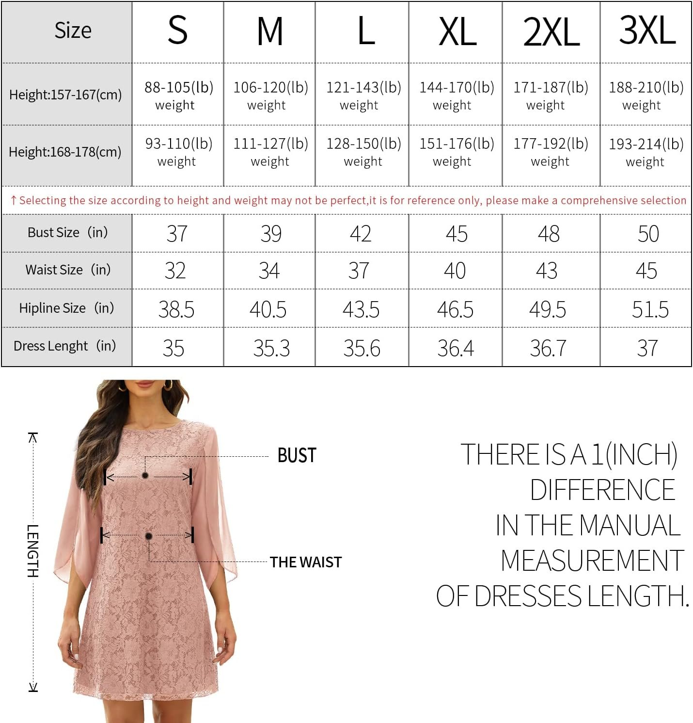 Please read the size chart clearly, And the dress length is above the knee length!Make sure to buy the right size according to your body shape!!There is 1(inch) difference in the manual measurement of dresses lenght.Due to the light and screen difference, the color may be slightly different from the pictures.The size data here is the tile size, please choose according to your body shape. It is recommended that you measure the clothes you usually wear flat and then choose according to the data (direct measurement of the body is generally larger than the tile)