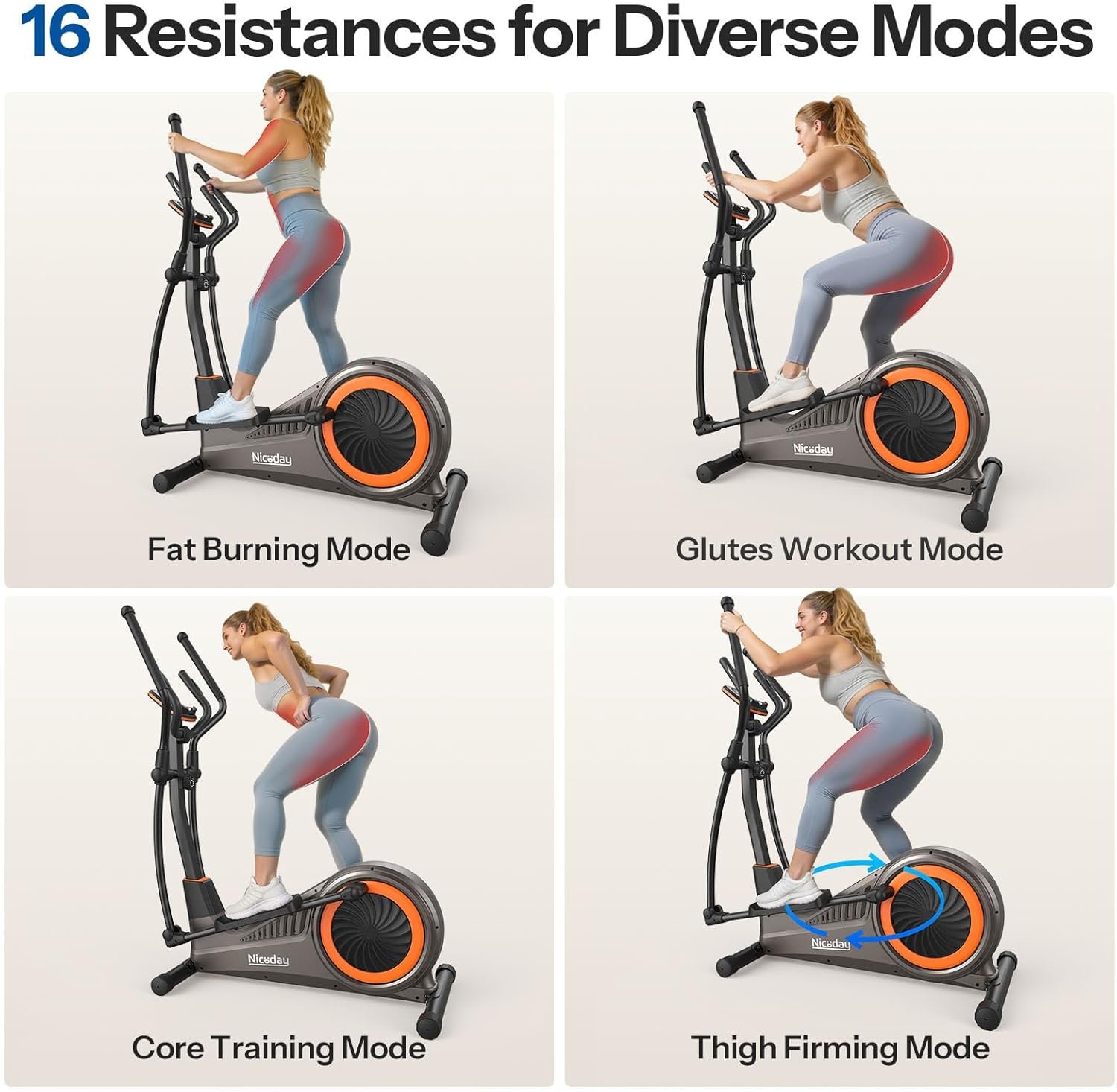 【400 LBS Weight Capacity】Double-thickened steel tube main frame and heavy-duty base are built with industrial-grade standards, delivering excellent stability and weight bearing capacity; Niceday elliptical will witness your every progress and remain your long-term fitness companion