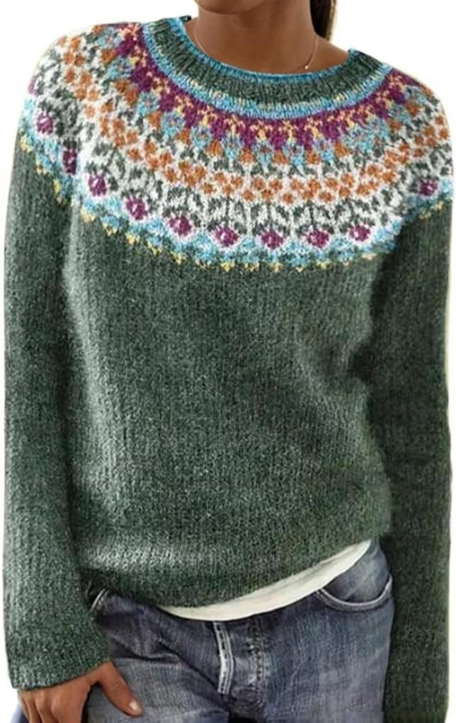 Akivide Women Fair Isle Print Sweater Casual Vintage Style Crewneck Knitted Pullover Sweater