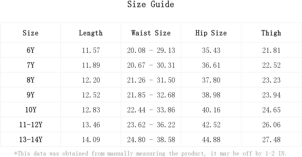 13-14Y:Hip Size:44.9IN,Length:14.1IN,Thigh:27.5IN,Waist Size:24.8-38.6IN
