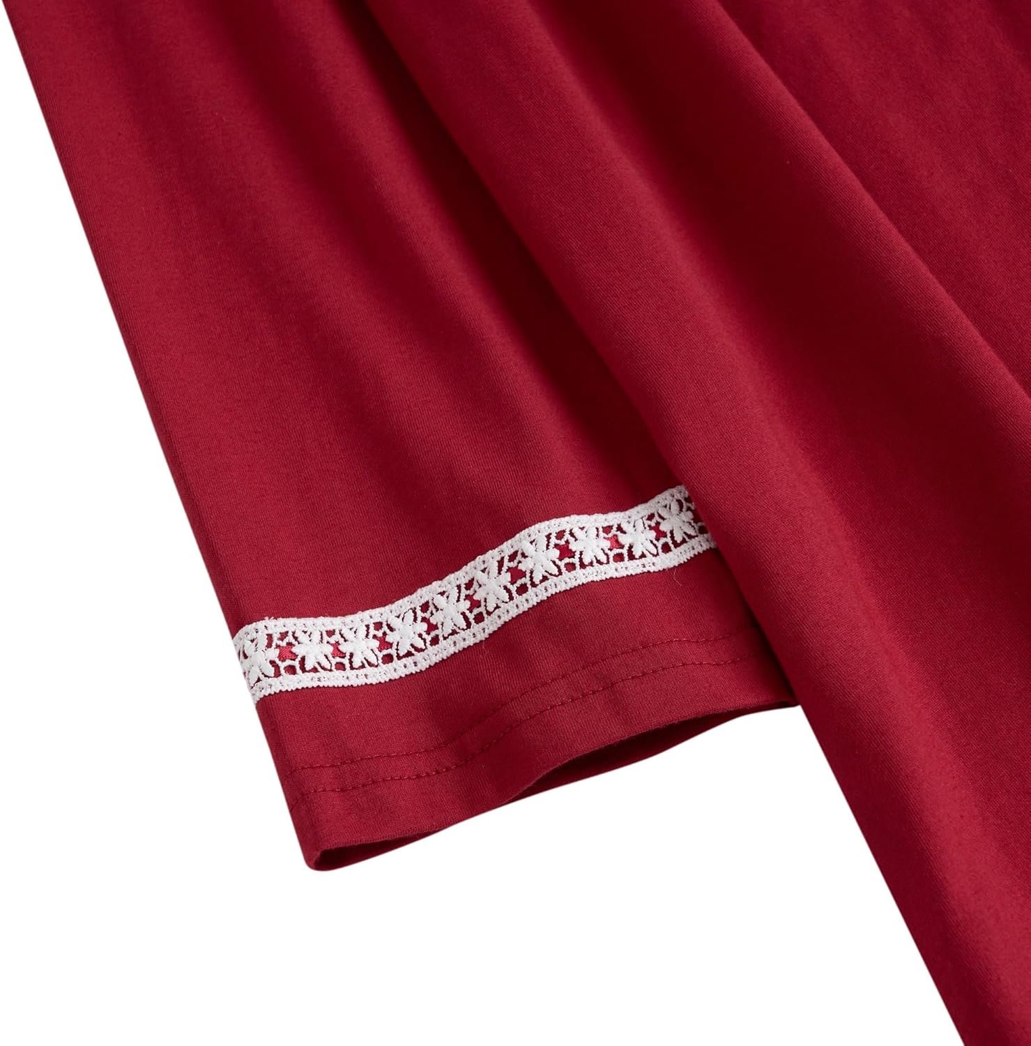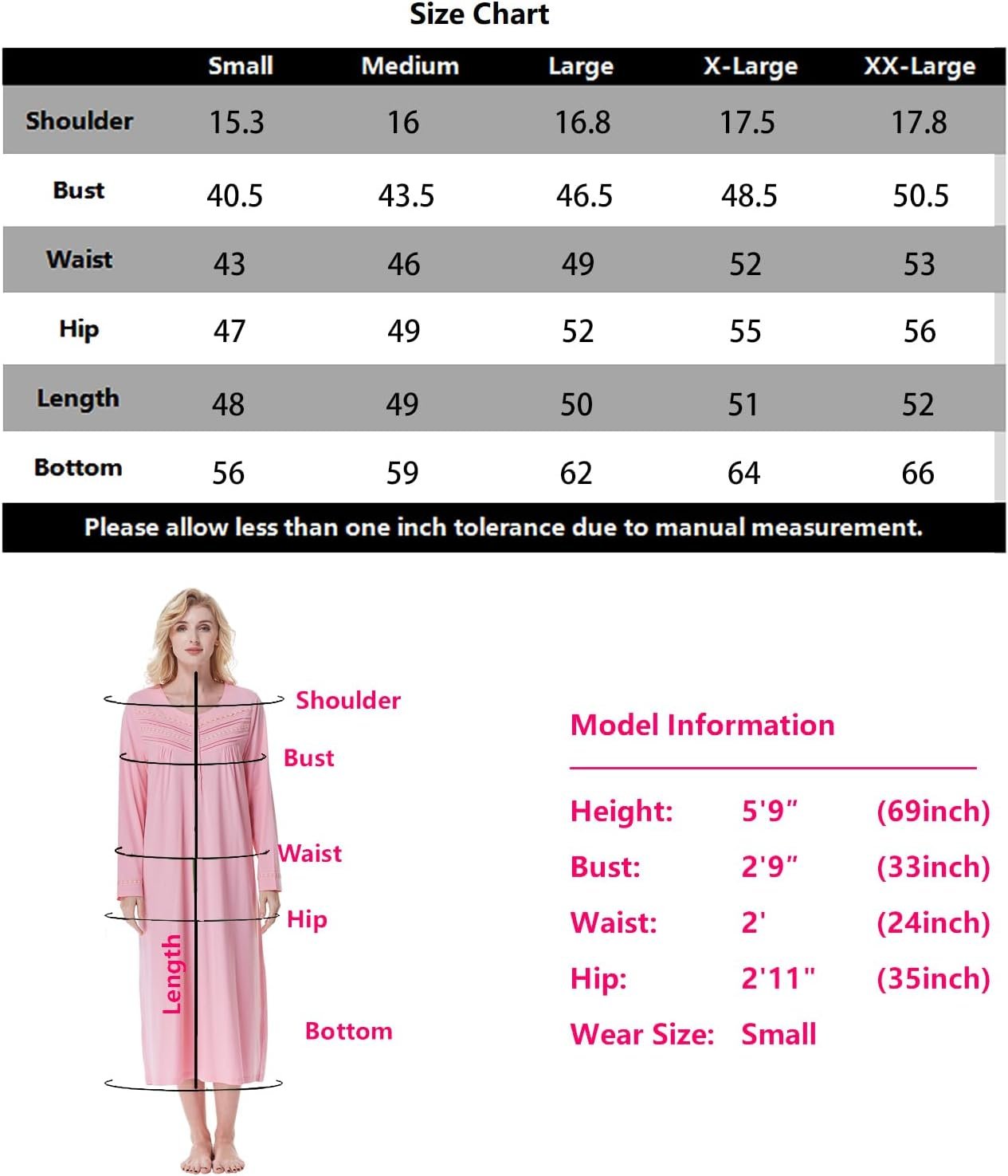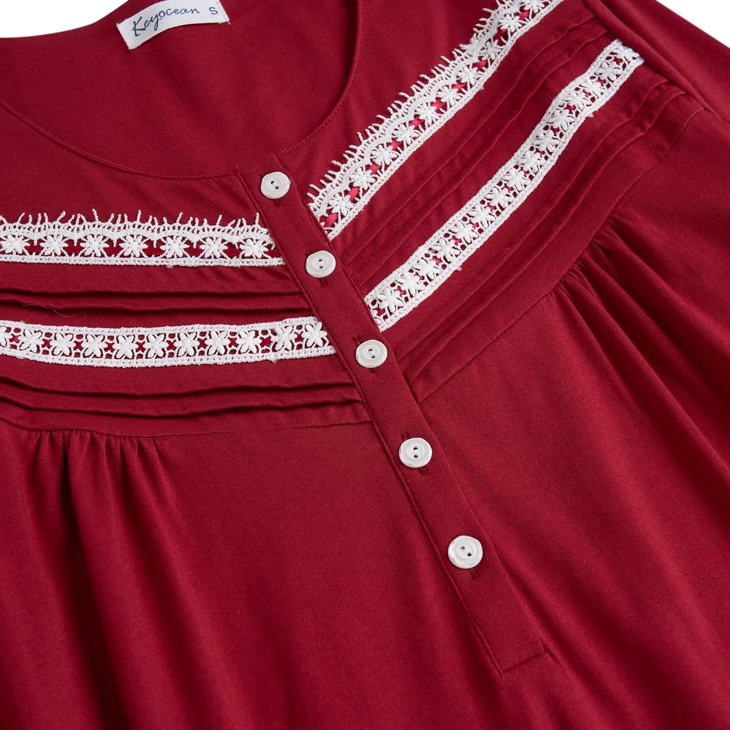 Fabric Content: 100% cotton (Cotton material SGS test report: # SL918092128119TX / Date: March 27, 2018)Length: mid-calf lengthComfortable cotton knit fabric; Lightweight fabric keeps your sleeping gown comfortable and stylishClosure: Pullover styling with button details at front necklineNeckline: Round neck with button placket Sleeve Length: Long sleeves Machine washable & tumble dry low