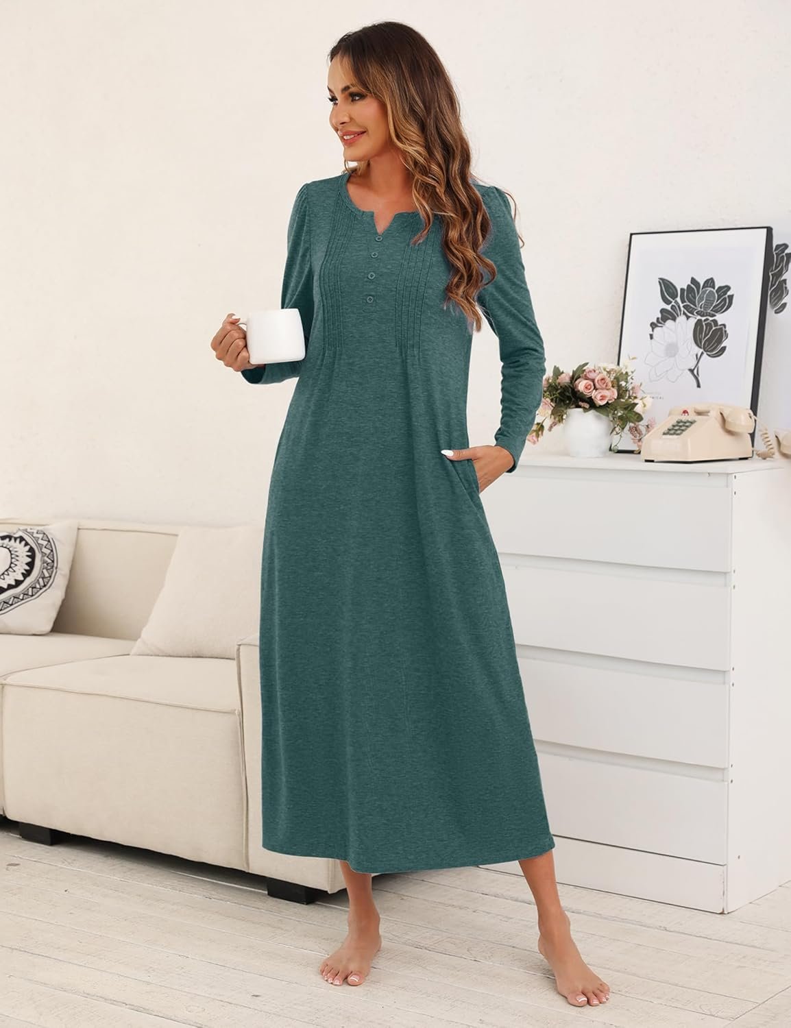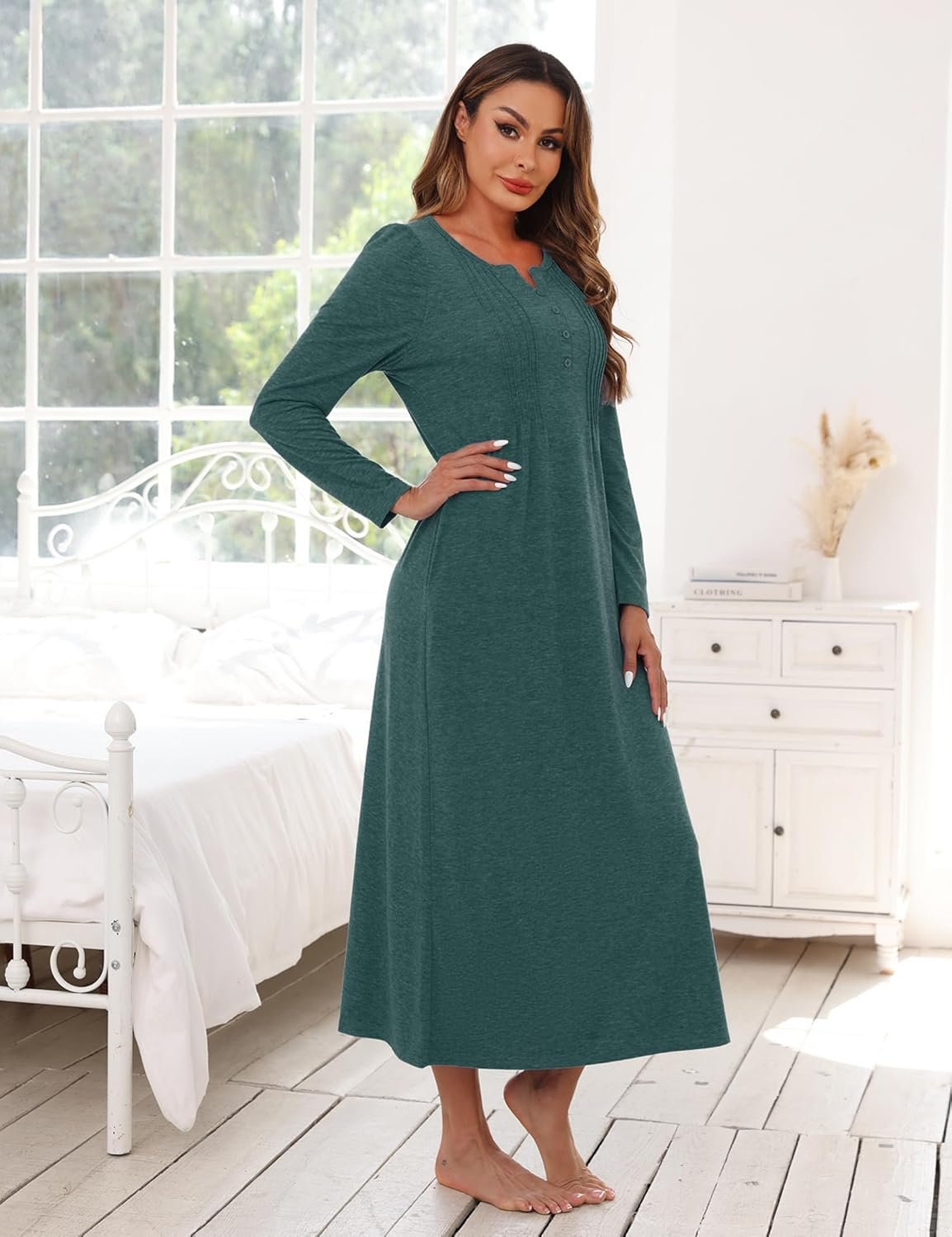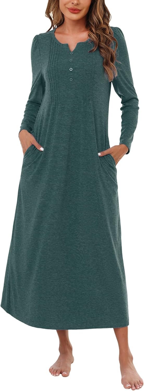 Long Sleeve Nightgowns for Women Cotton Long Sleepshirts with Pockets