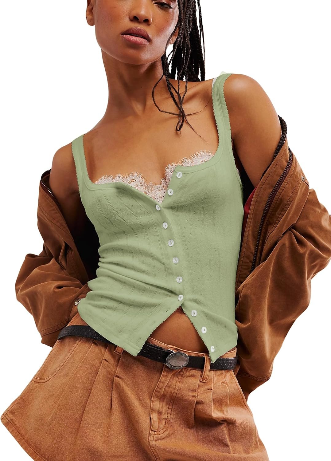 Model Size:S Womens Square Neck lace Trim Slim Fitted Open Front Y2K Shirt 2025