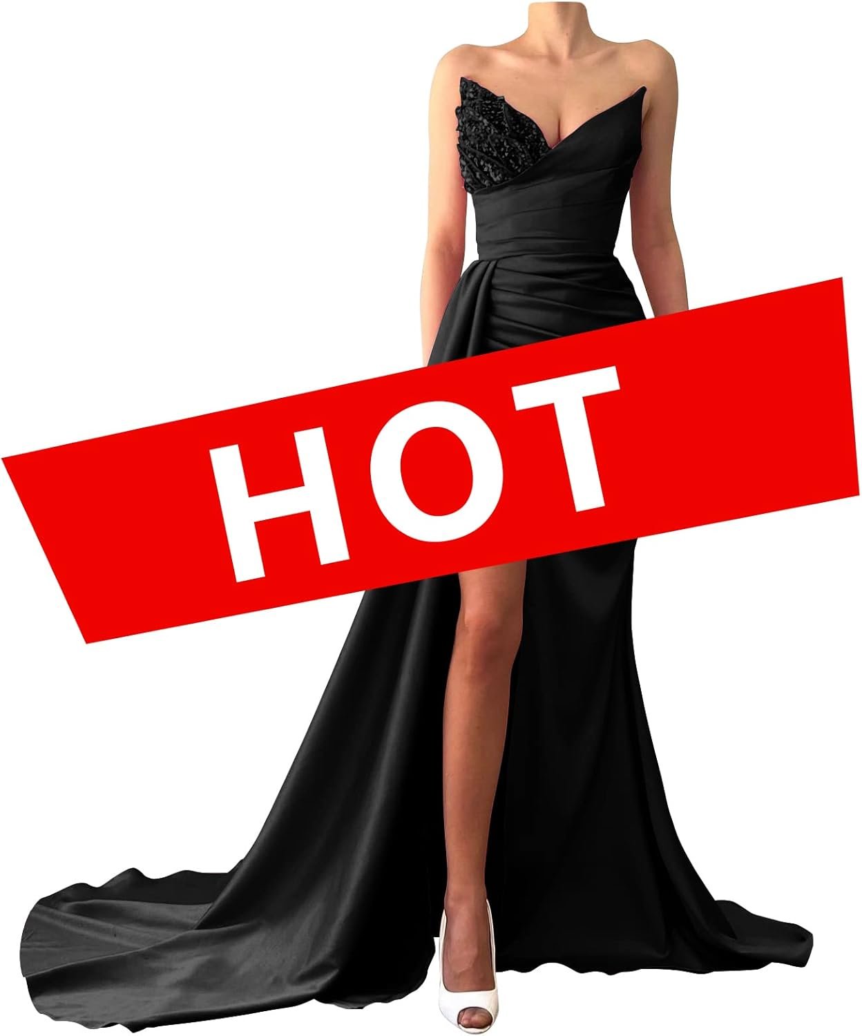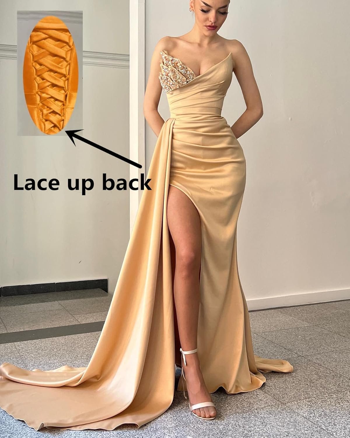Strapless Mermaid Sequin Beaded Satin Long Slit Prom Dresses for Women Bridesmaid DressesStrapless Mermaid Sequin Beaded Satin Long Slit Prom Dresses for Women Bridesmaid Dresses