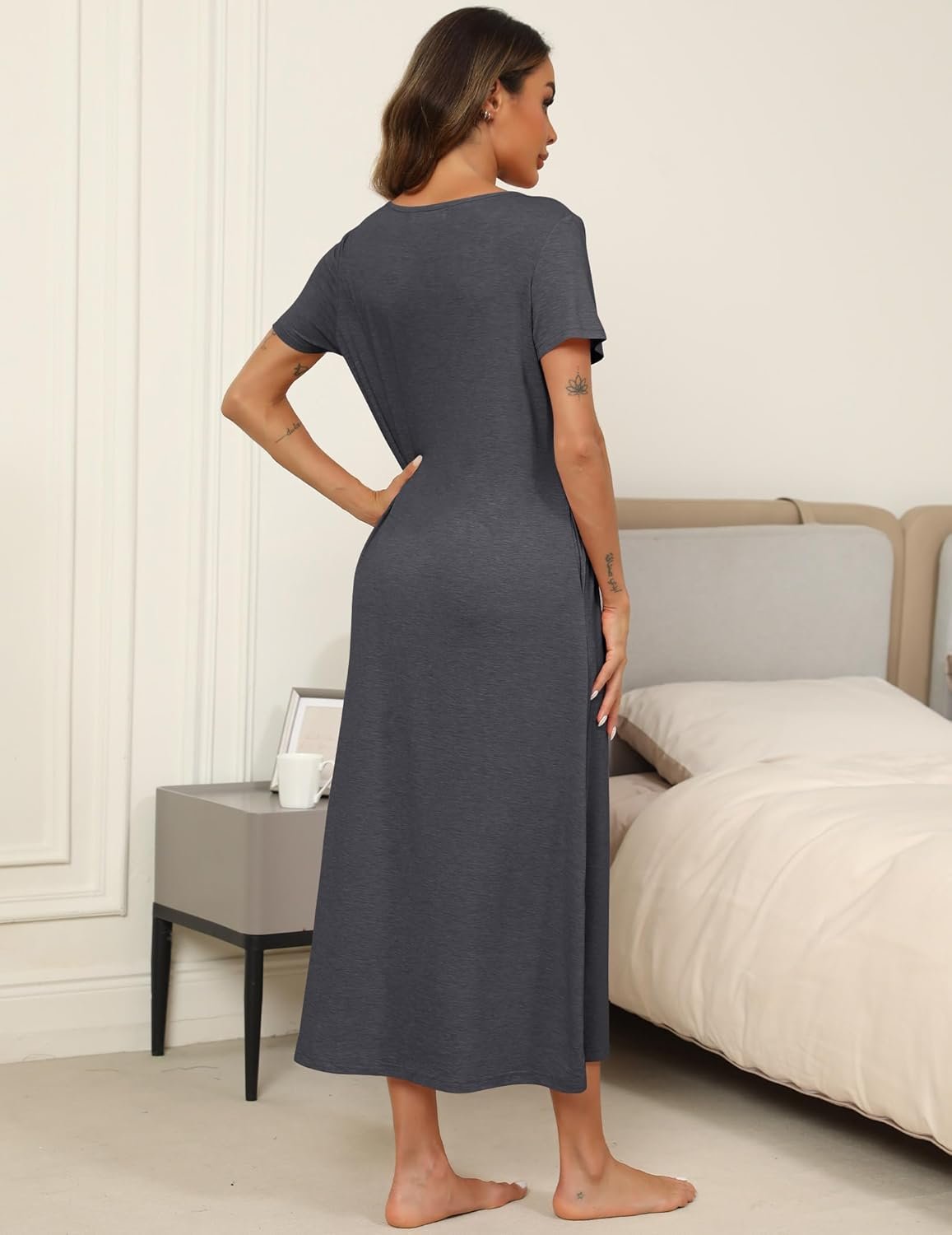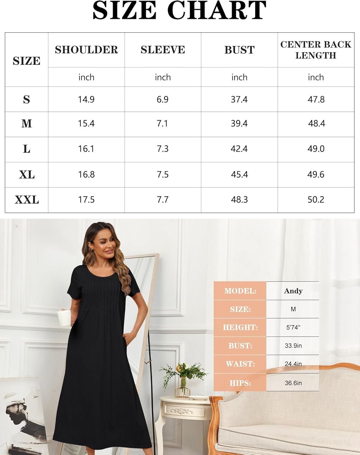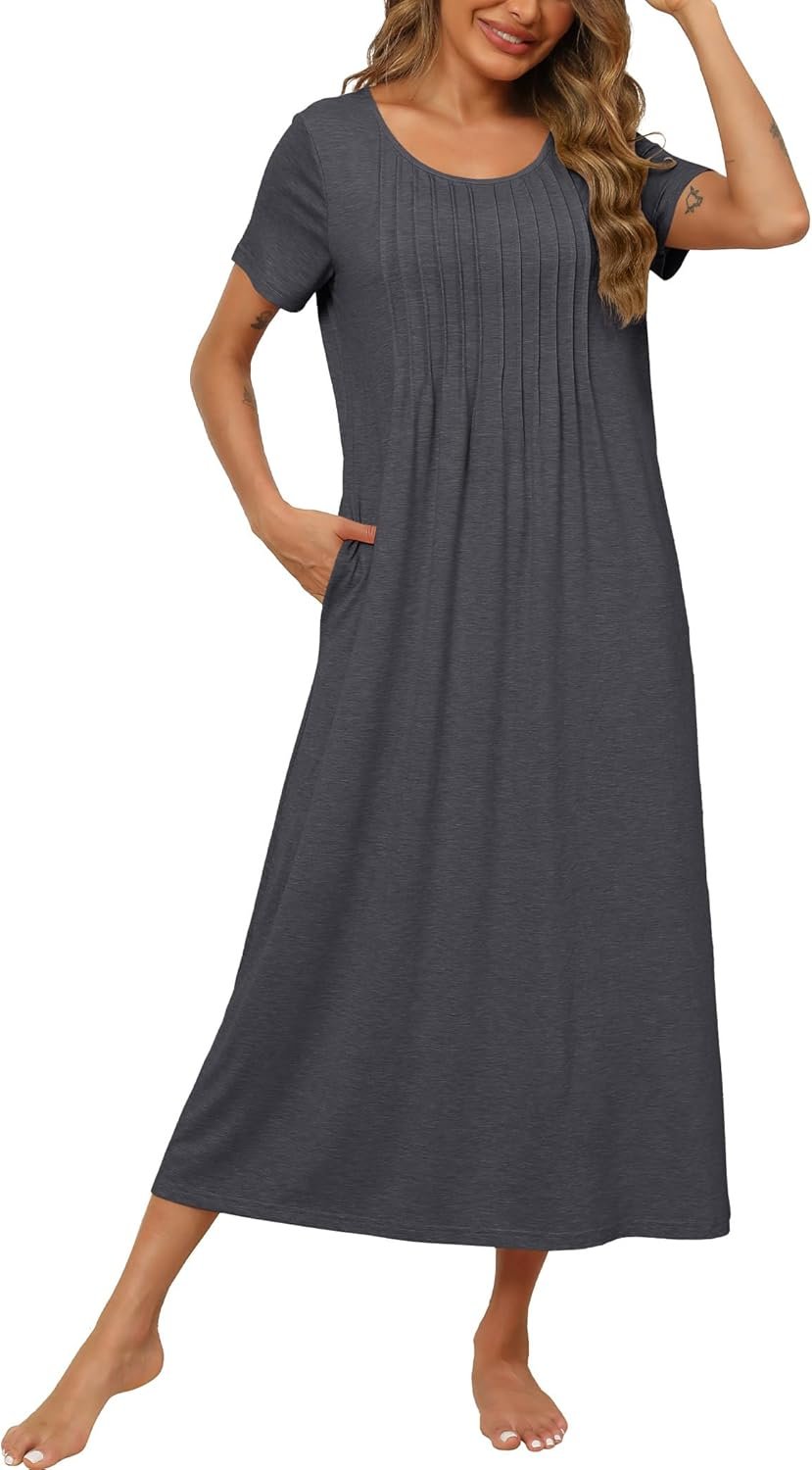 Women’s Long Nightgown Short Sleeve Loungewear Pleated Front Nightshirt with Pockets