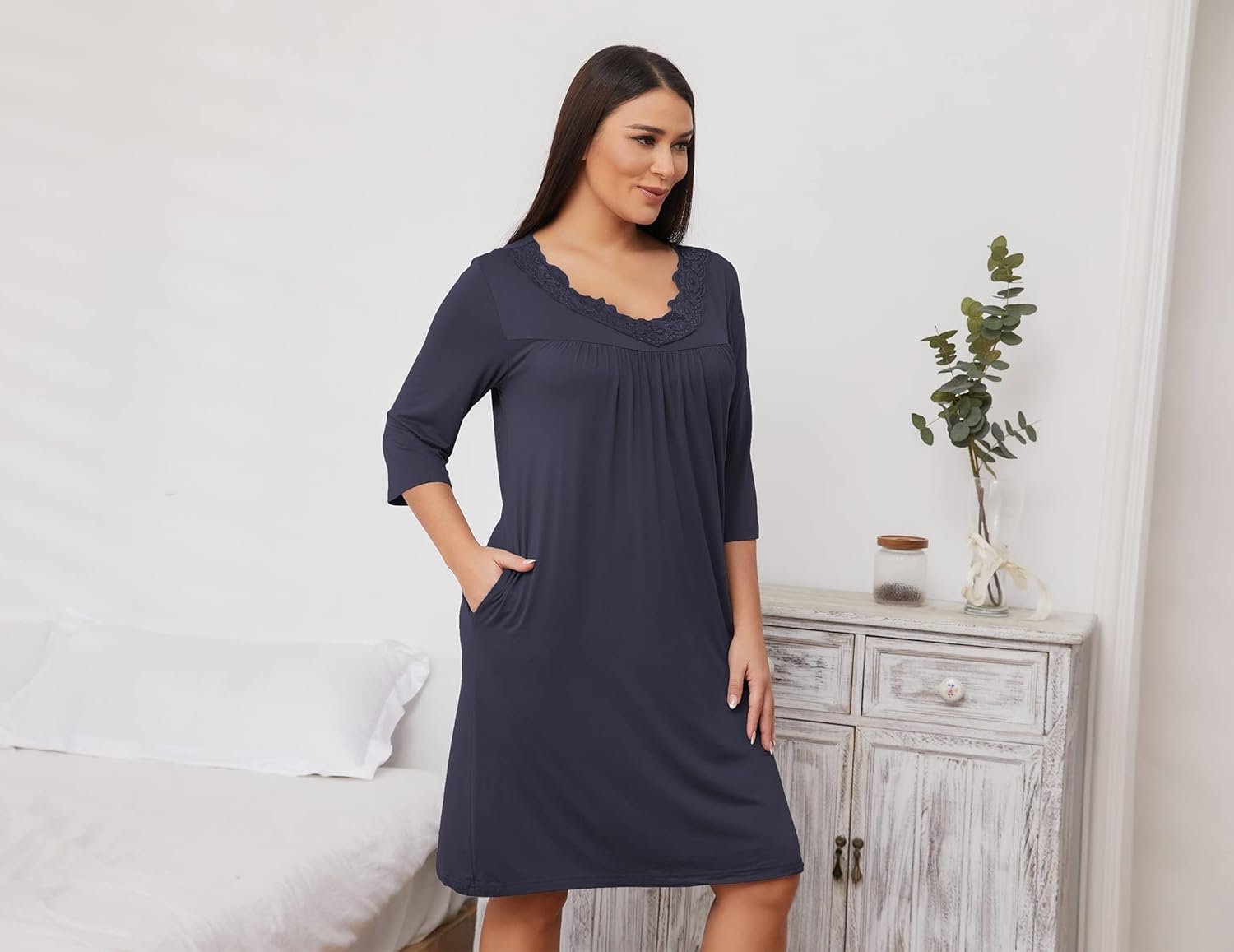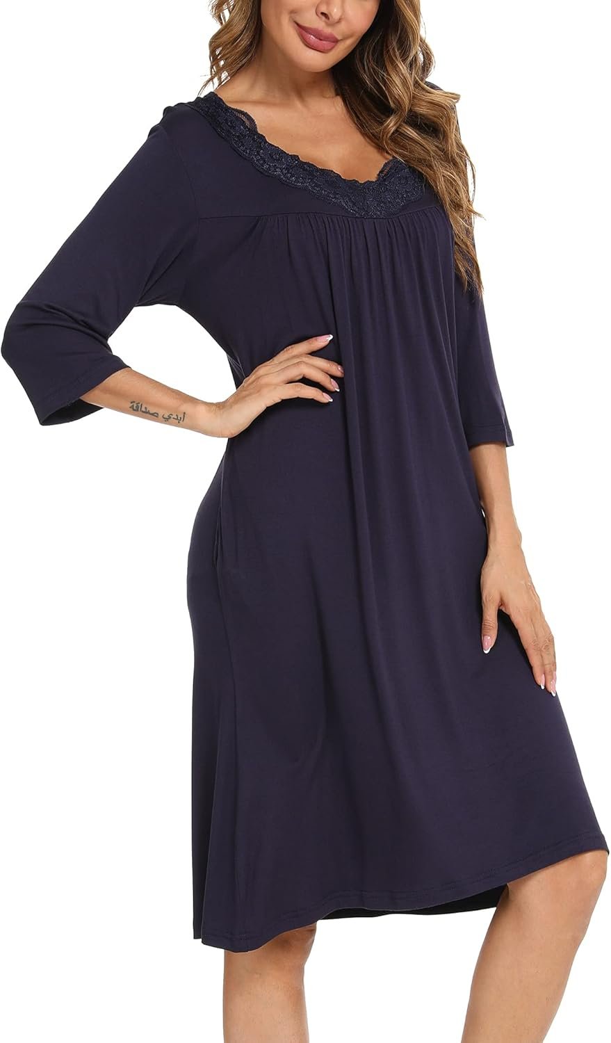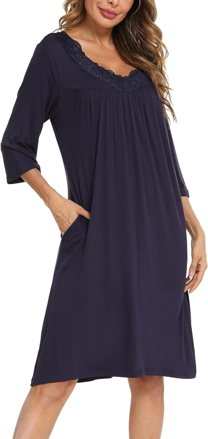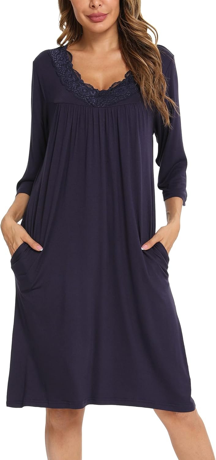 YYA Nightgowns for Women 3/4 Sleeve Sleepwear Lace Comfy Sleep Gowns Pleated V Neck Plus Size Nightshirt S-4XL