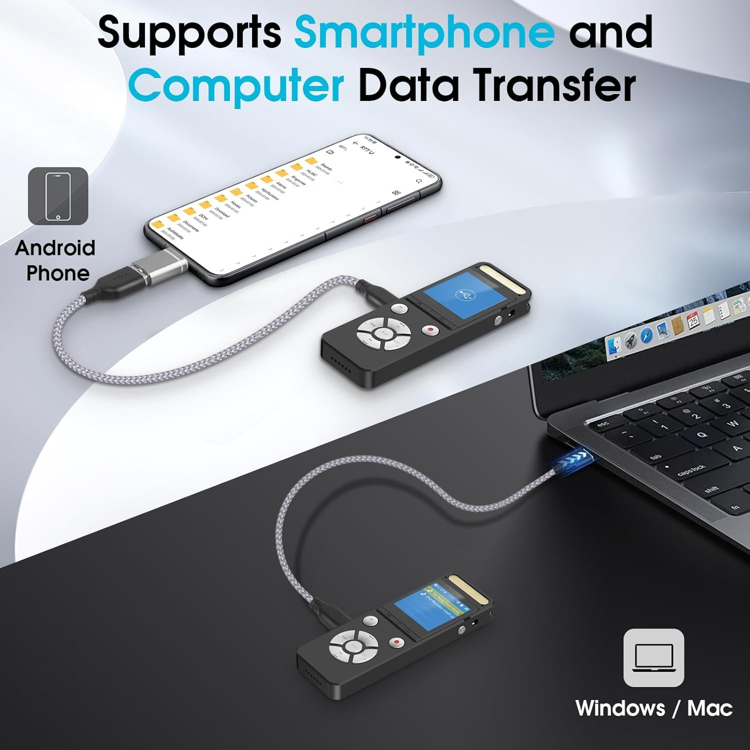 Supports Smartphone and Computer Data Transfer: Compatible with both Mac and Android system. With the provided OTG data cable you can connect your iPhone or Android Phone to transfer or listen your recording files, greatly facilitating your daily life. All the recording files be saved with timestamp, which will allow you to easily access specific recordings and greatly enhances the experience