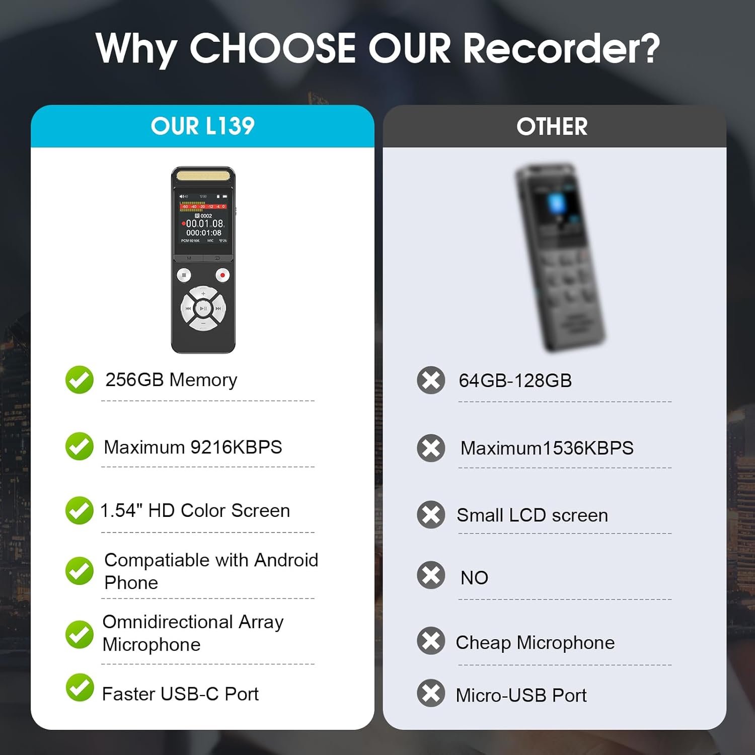 Easy to Use: L139 recorder is easy to operate, you can realize one key recording saving and playback, the operation interface is simple and easy to understand, equipped with a 1.54inch display can make the operation more clear, so that users can easily get started, even for the first time users can quickly master the operation skills