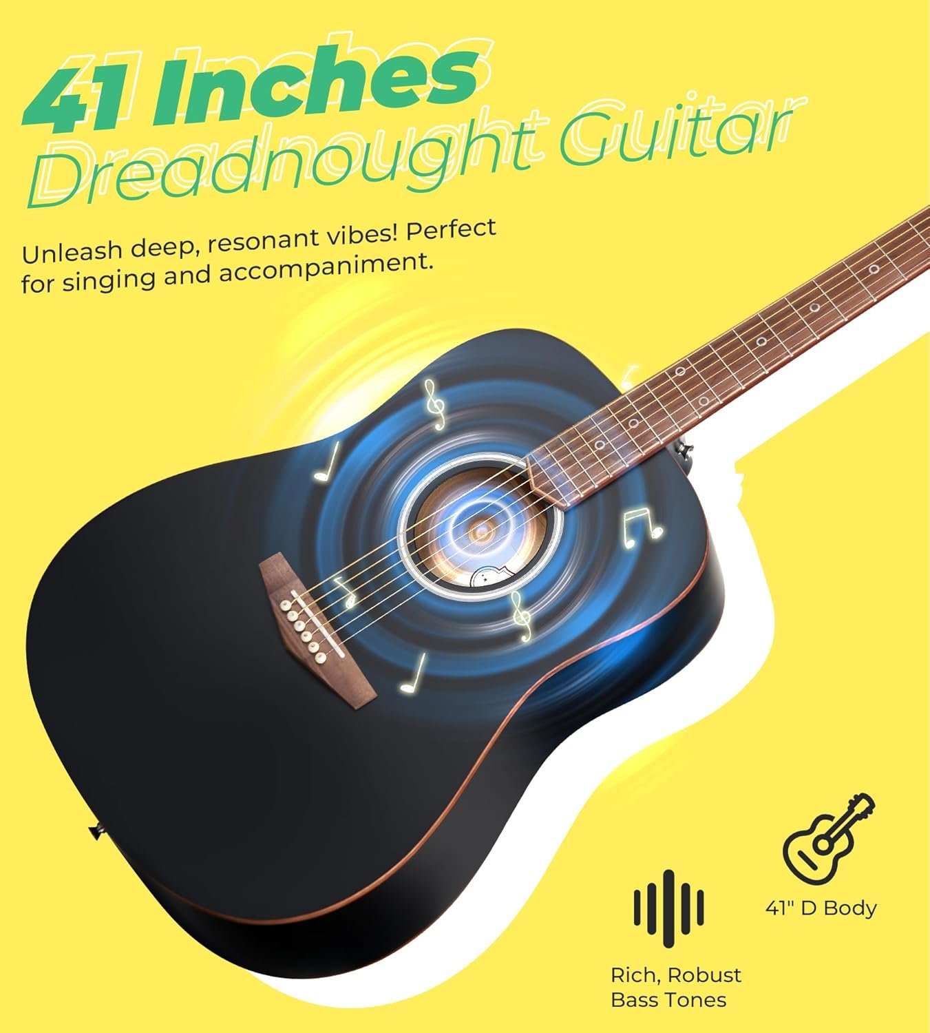 CLASSIC DREADNOUGHT DESIGN: With its iconic dreadnought body, this beginner dreadnought acoustic guitar offers a rich, balanced tone with strong bass and clear mids and highs. Ideal for both strumming and fingerpicking, it excels in folk, bluegrass, and rock genres. The dreadnought body is perfect for beginners but also suits advanced players, thanks to its excellent sound and playability, making it one of the most popular guitar styles worldwide.