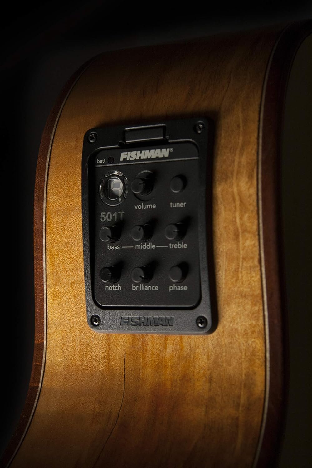 FISHMAN ELECTRONICS The Washburn G66SCE is a fantastic sounding acoustic guitar but the addition of premium Fishman electronics makes for an outstanding stage performance guitar. Equipped with the Fishman 501T Presys+ integrated tuner/preamp system for versatile amplified tonal shaping