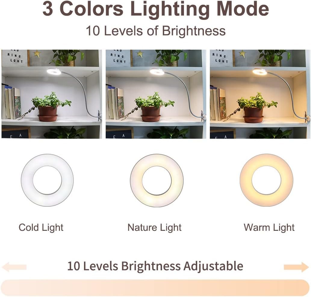 【3 Light Modes &10 Brightness Levels】 Dimmable LED desk ring light with 3 lighting modes: warm light (3000K), warm–white light (4500K) and white light (6500K). Each lighting mode has 10 adjustable brightness to choose. Built-in controller easy to power on/off and switch to the lighting mode to fit your various use.