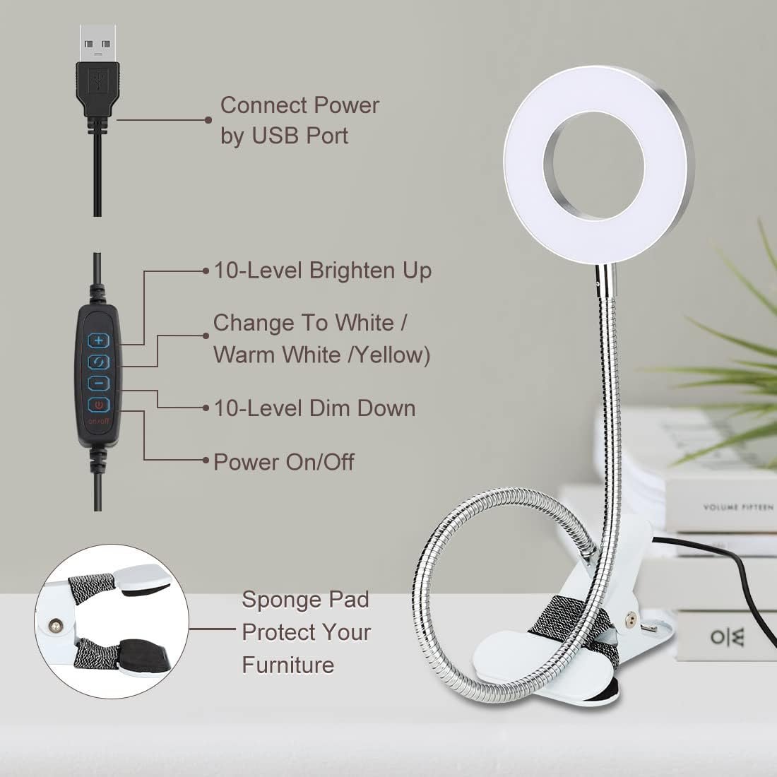 【Flexible Arm & Strong Clip】Flexible gooseneck arm can be bent into any shape to adjust the lighting direction. The strong metal clamp opens up to 2 inches, easy to clip on table, desk or bedside. Non-slip pads protect your furniture from scratching. The clamp can stand on the desk by itself if the arm is bent in proper shape. (See the pictures)