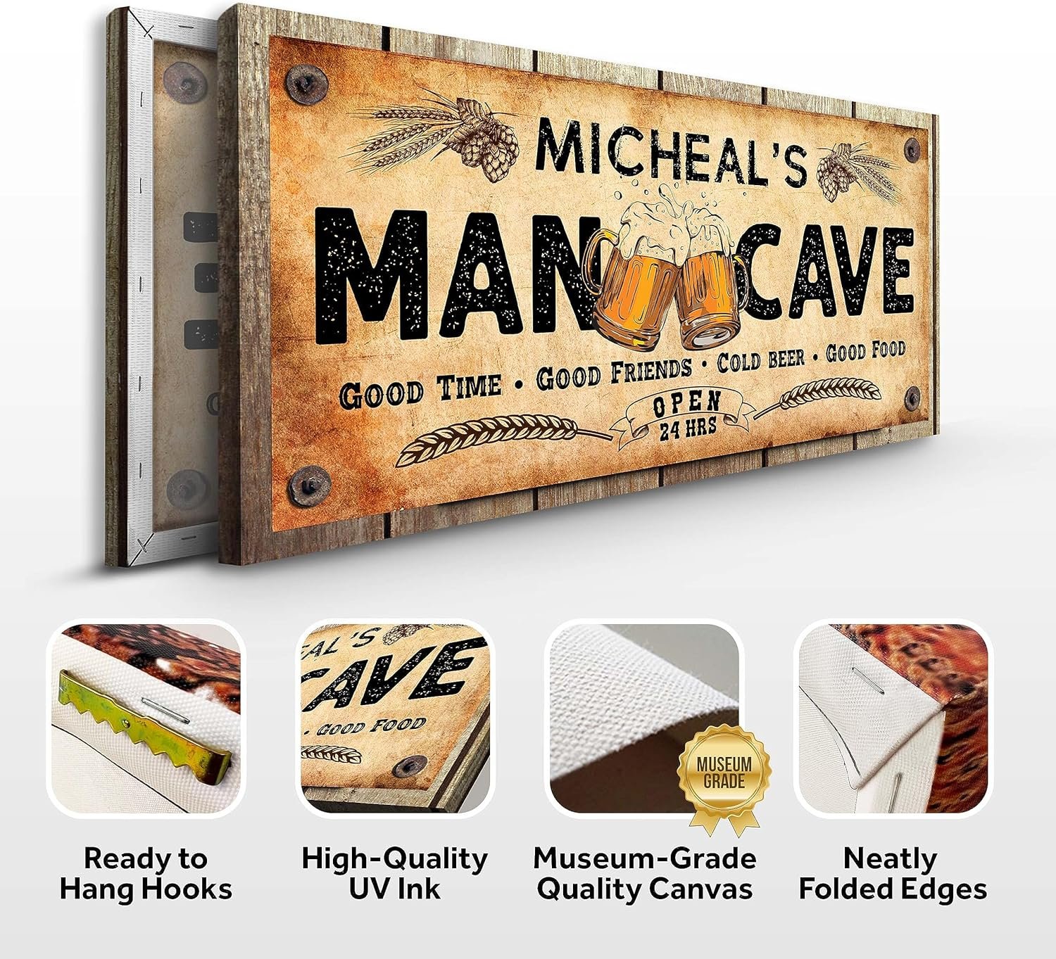 Museum-Grade Quality – This Man Cave Sign Decor Prime Gallery-Wrapped Canvas; No sagging, dents, accidental rips; Printed using UV-Resistant Ink with a neatly folded edge