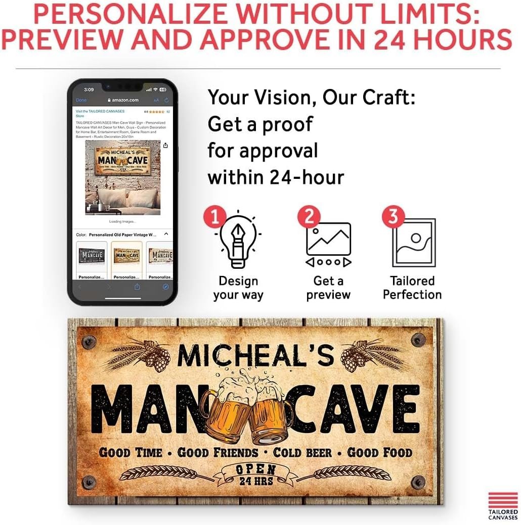 You get a Preview with a Lifetime Warranty – Check your Personalized Man Cave Sign Decor sent by our Quality Control Team within a day via Amazon Messaging; Love it or We’ll make it right for you, no questions asked! Click “Customized Now” & Lets turn your Ideas into Reality!