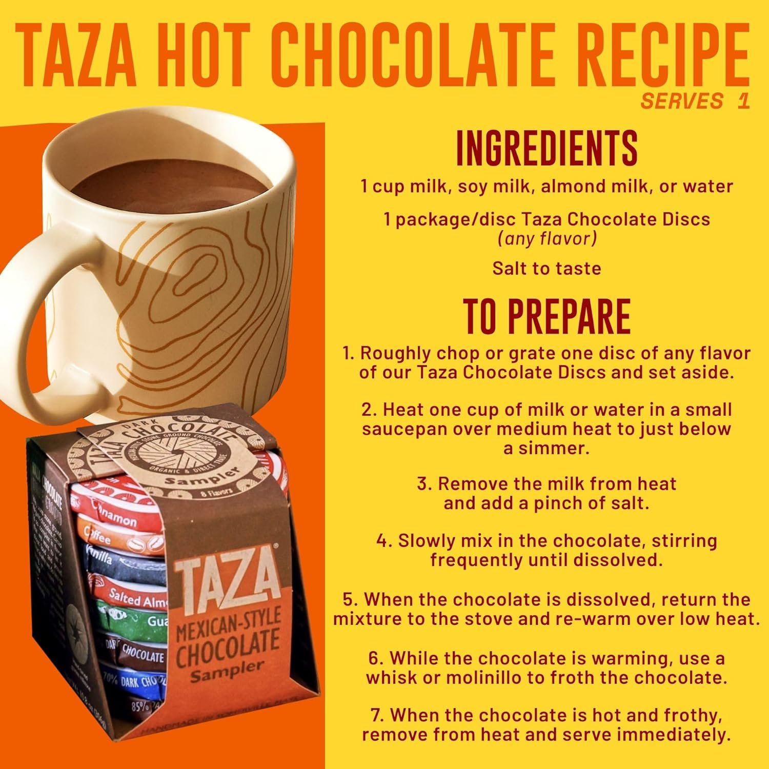 Indulge in our gourmet organic chocolate that is vegan, gluten-free, dairy-free, and soy-free; Taza Dark Chocolate Discs are crafted from the finest cocoa, with a bold and rustic stone-ground texture; Try every flavor of Taza’s Chocolate Mexican-style discs A great way to sample and share stone-ground chocolate with true grit; Eight bright, bold flavors range from spicy to sweet to savory; Contains 8 x 1.35 oz Chocolate Mexican-Style Discs: Cacao Puro, Guajillo Chili, Cinnamon, Coffee, Sea Salt, 85% Super Dark, Salted Almond, and Vanilla; Our Mexican-Style Chocolate Sampler showcases the bold flavor and texture of stone ground chocolate; It starts with Taza Direct Trade; We said no to predatory middlemen and abusive labor practices; We created the chocolate industry’s first third-party certified Direct Trade cacao sourcing program, to ensure quality and transparency for all; We have real, face-to-face relationships with growers who respect the environment and fair labor practices.