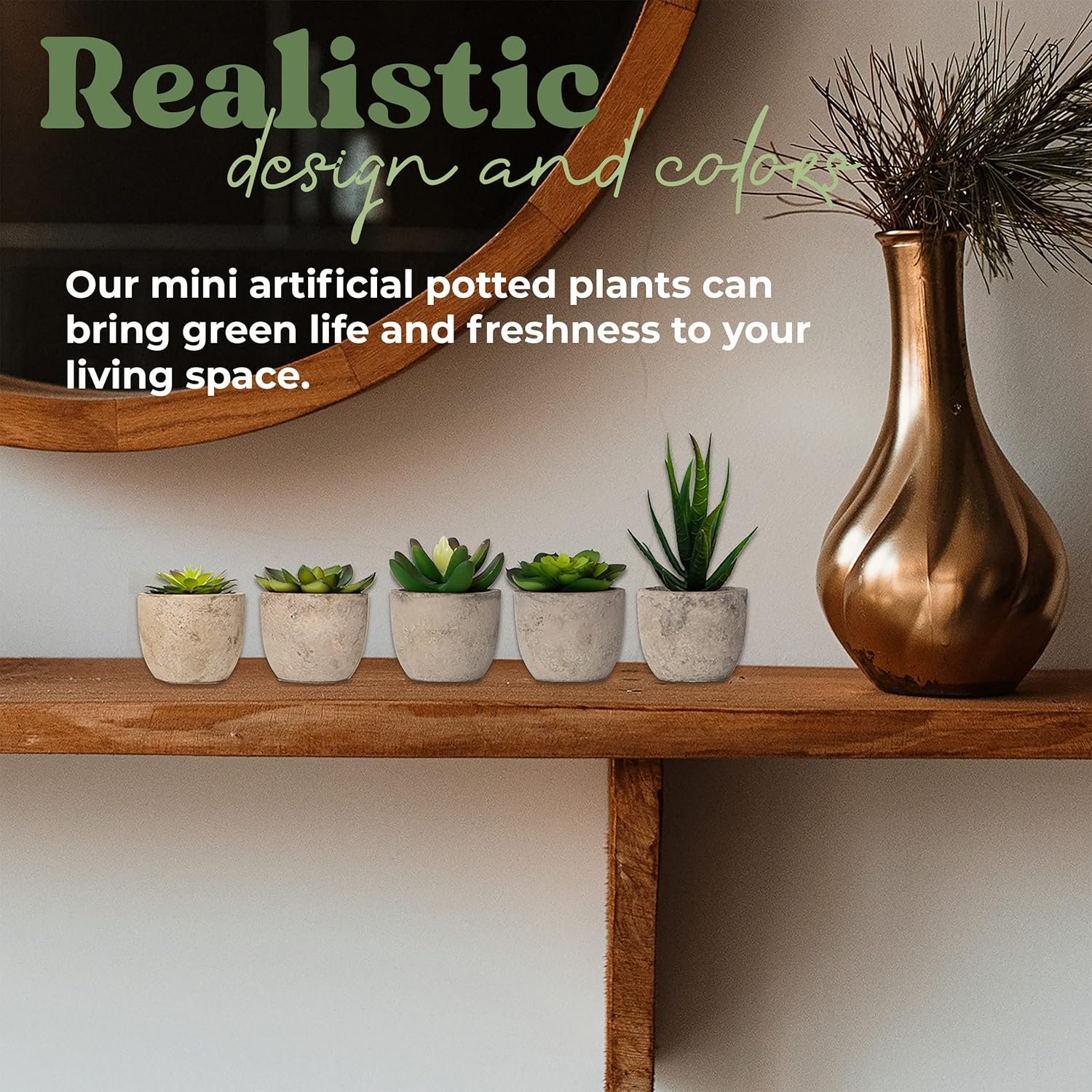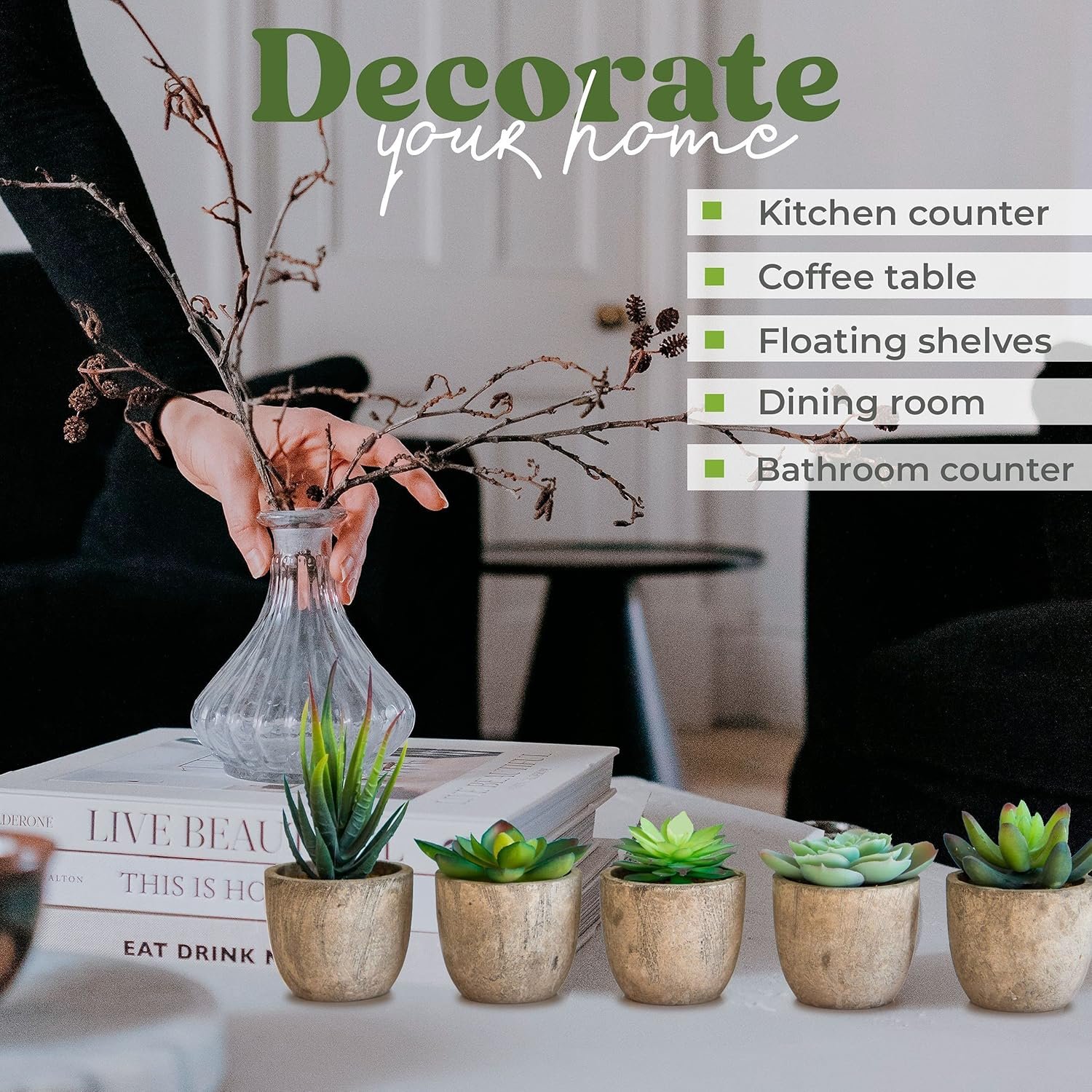 ADD NATURAL VIBES TO ANY ROOM – Looking for a way to liven up your home without spending a fortune decorating? Our fake succulent plants are just the right size for shelf decor and make the perfect centerpieces for dining room tables. They’re also great for spicing up kitchen tables, foyers, windows, college dorms, TV stands, bathtub corners and tons more!