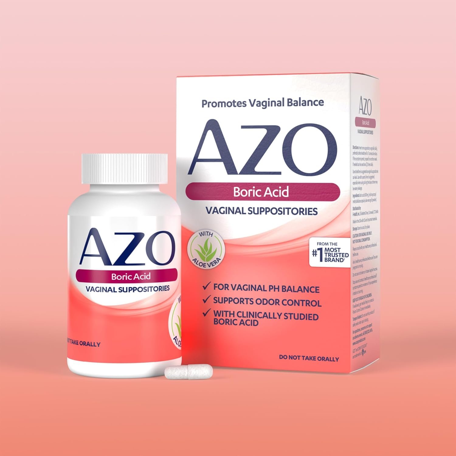 ODOR CONTROL – AZO Boric Acid Vaginal Suppositories help support odor control. From the most trusted brand in Urinary Health, start a better vaginal health routine today with AZO Boric Acid, free from GMOs, synthetic ingredients, perfumes, preservatives and artificial dyes