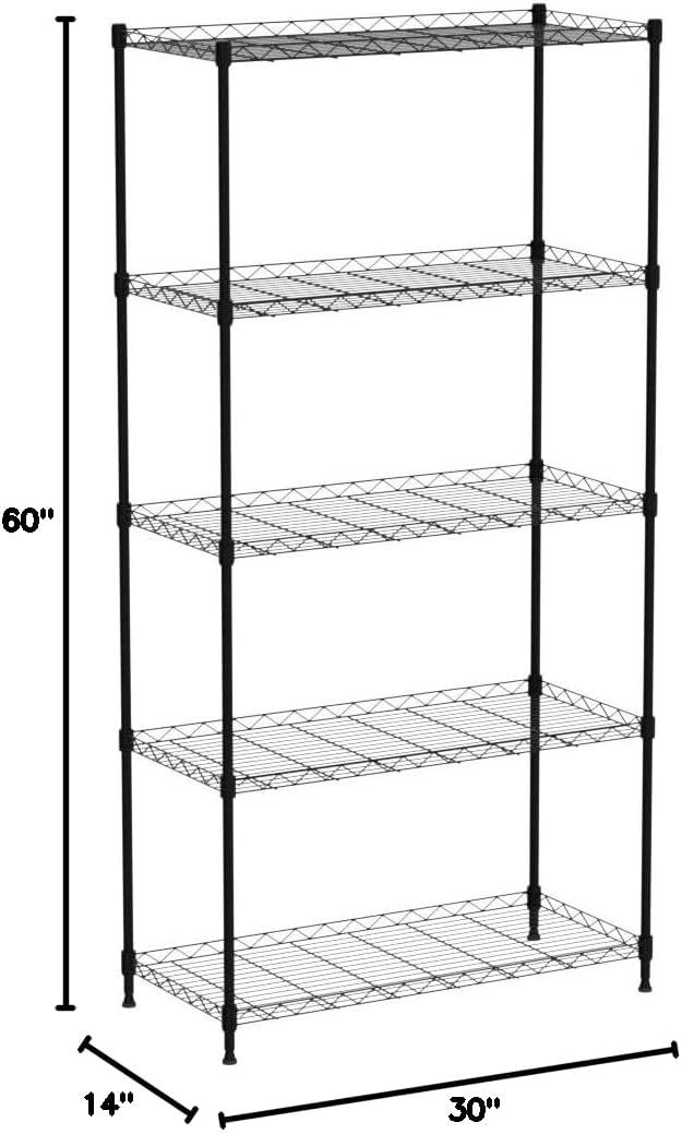 Organize your home or office with Seville Classics’ 5-Tier Wire Shelving System. This system is constructed from industrial-strength steel and features a black epoxy powder-coat finish which provides the same corrosion resistance to chrome plating. These shelves are perfect for adding extra storage around the house, tidying garages, and organizing office spaces. Assemble with the screw-in leveling feet for a high-capacity storage solution. Unit features industrial-strength steel wire construction for multipurpose storage. Black finish provides necessary corrosion resistance in dry environments. Casters allow for easy positioning in the kitchen, garage, or office Shelves adjust at 1″ increments Includes leveling feet No tools required for assembly Limited 10-year Specifications Dimensions: 30″ W x 14″ D x 60″ H Capacity on leveling feet: 300 lbs. per shelf Total system capacity on leveling feet: 1500 lbs. Weight: 28. 5 lbs. Model #: WEB675