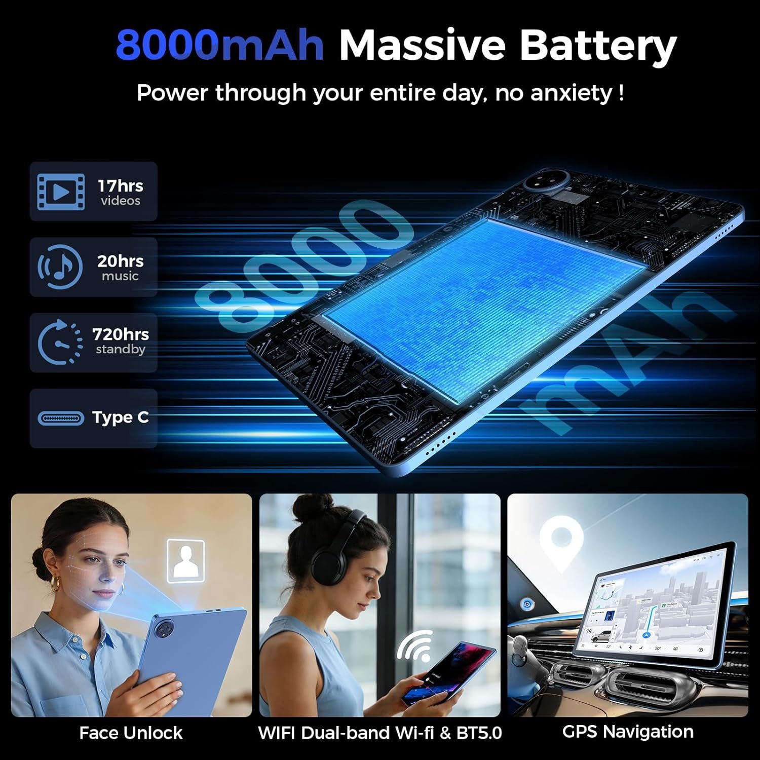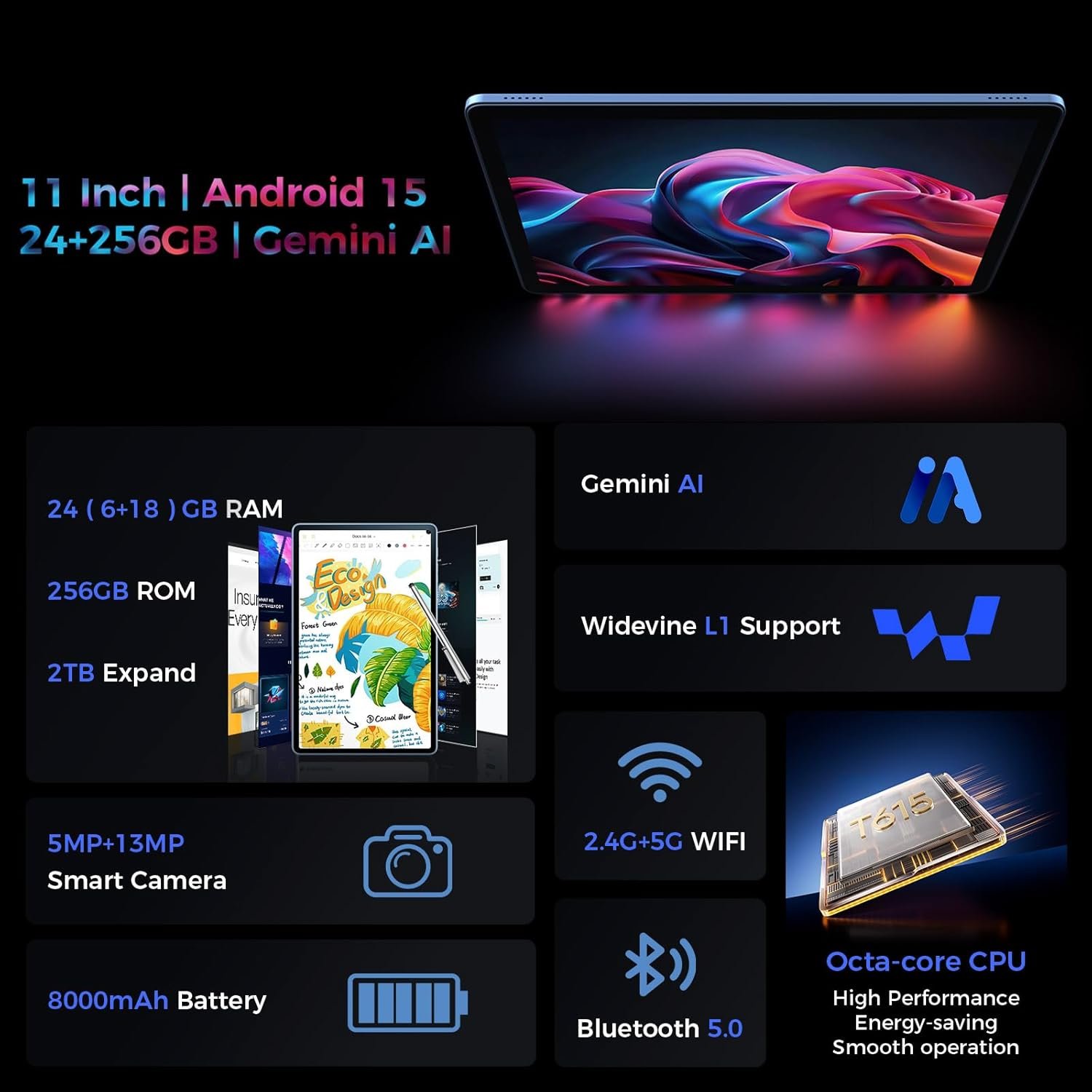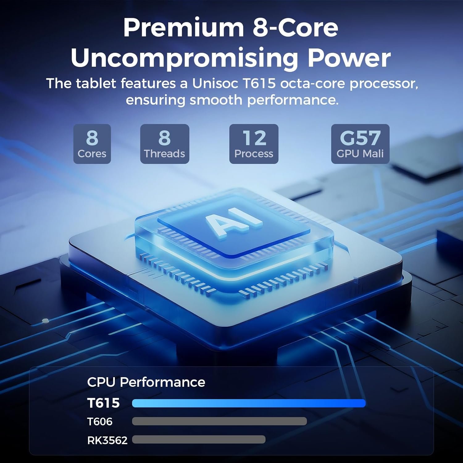 【Unmatched Octa-core & Fast Connectivity】The 11 inch tablet is built with a high-performance T615 octa-core processor, which provides sufficient power to support complex scenarios such as simultaneous operation of multiple applications, HD video editing, and large-scale mobile game running, ensuring consistent and smooth device performance. Dual-band 2.4GHz+5GHz Wi-Fi and Bluetooth 5.0 ensure fast networking and broader device connectivity