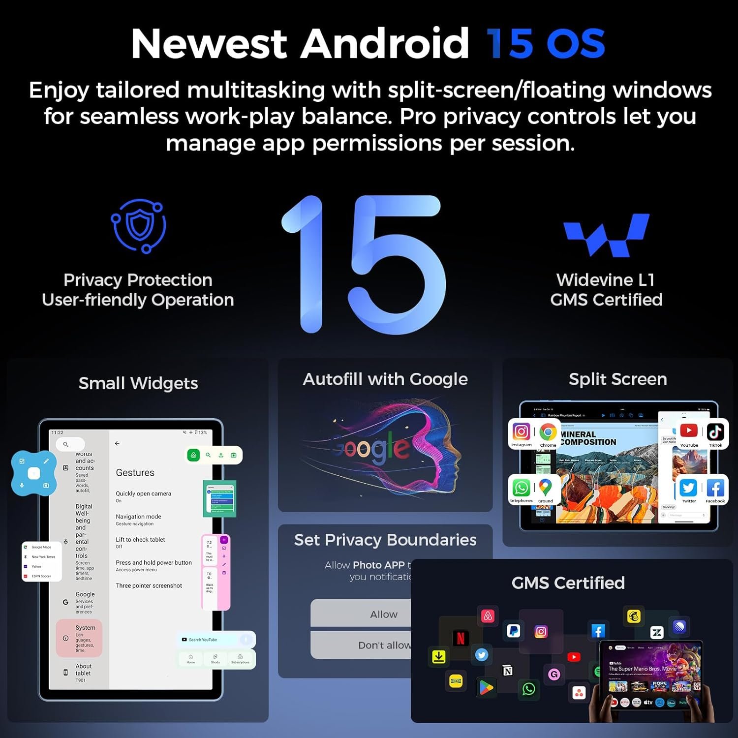 【Android 15 + Gemini AI Tablet】Suicoey Android 15 Tablet blends excellent privacy protection with seamless control. Features such as app permission management and facial recognition safeguard your privacy. Split-screen mode, widgets, and auto-fill enhance your productivity. This 11-inch tablet supports Gemini AI, acting as a 24-hour assistant for your daily tasks. Whether generating meeting minutes, providing real-time translation, or planning travel itineraries, the tablet handles everything efficiently