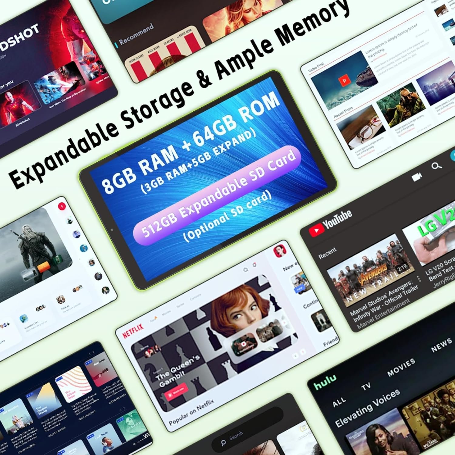 【64GB Storage + 512GB Expandable – Store More】 Whether you’re using this tablet 8.7 inch for videos, apps, or files, its 64GB storage (expandable to 512GB via microSD) makes it a smart choice for media lovers and students.